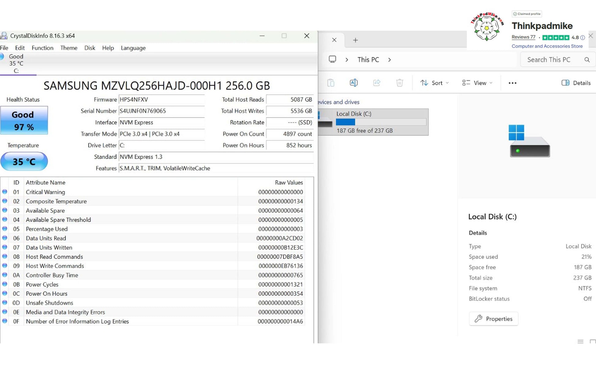 The SSD has been checked using the Crystal Disk Info application and it reports Good health and a good temperature as you can see. The laptop then has a full diagnostic scan to ensure there are no failings or issues, as you will see in the video it passed without any issues. It is then left to run for at least 24 hours (generally 48 hours) without been allowed to sleep or hibernate to ensure no issues develop.