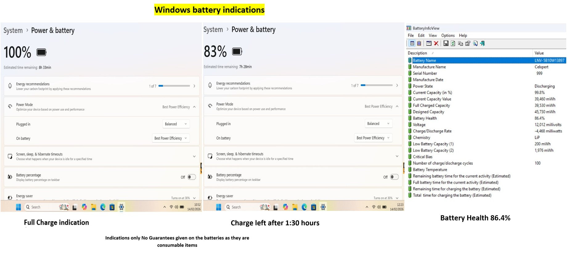 This model has 1 x 45Wh Internal battery Windows has indicated 8:33 after a full charge, the laptop has then been left to run on the batteries for 1:30 hours after which Windows indicated 7:28 hours remaining @ 83%