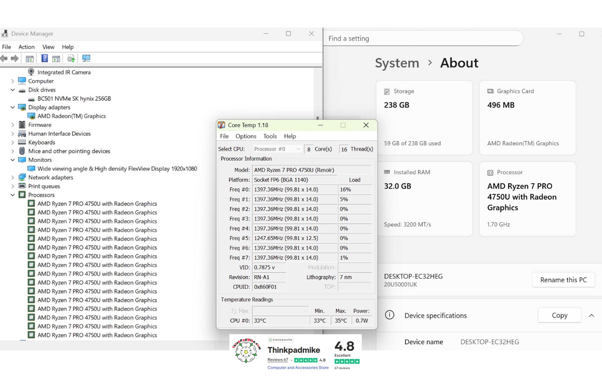 Processor - AMD Ryzen 7 Pro 4750U 1.7Ghz to 4.1Ghz 8MB Cache 8 cores 16 threads (Renoir )