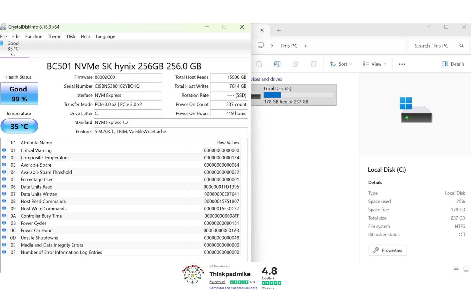 The SSD has been checked using the Crystal Disk Info application and it reports Good health and a good temperature as you can see. The laptop then has a full diagnostic scan to ensure there are no failings or issues, as you will see in the video it passed without any issues. It is then left to run for at least 24 hours (generally 48 hours) without been allowed to sleep or hibernate to ensure no issues develop.