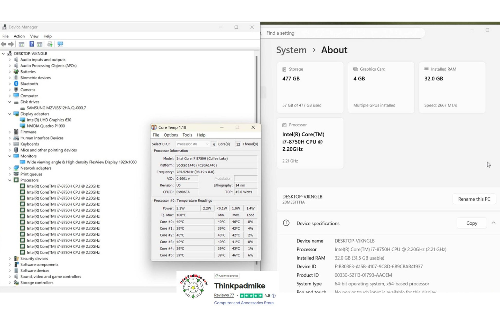 Lenovo ThinkPad P1 lightweight mobile workstation powered by Intel i7-8750H 6-core processor with 32GB RAM and fast 512GB NVMe SSD. Features 15.6″ IPS Full HD display and NVIDIA Quadro P1000 4GB professional graphics. Includes UK backlit keyboard and fingerprint reader. Upgrade-ready with spare M.2 slot. Strong 80,400mWh battery showing over 90% health. Weighs just 1.7kg — powerful yet highly portable.