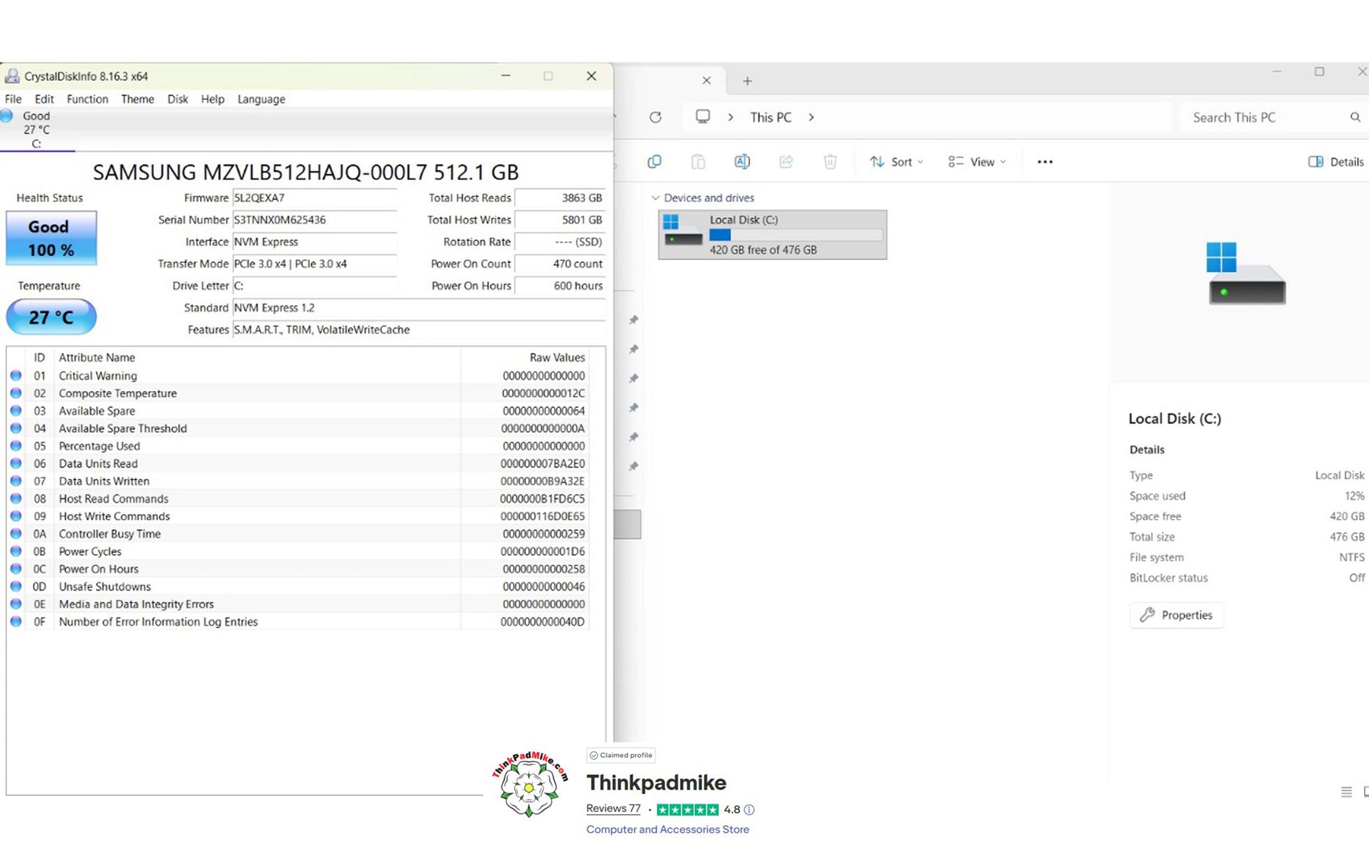 The drive has been checked using the Crystal Disk application and as you can see, it reports Good health and a good temperature, . The laptop then has a full diagnostic scan to ensure there are no failings or issues, as you will see in the video it passed without any issues. It is then left to run for at least 24 hours without been allowed to sleep or hibernate to ensure no issues develop.