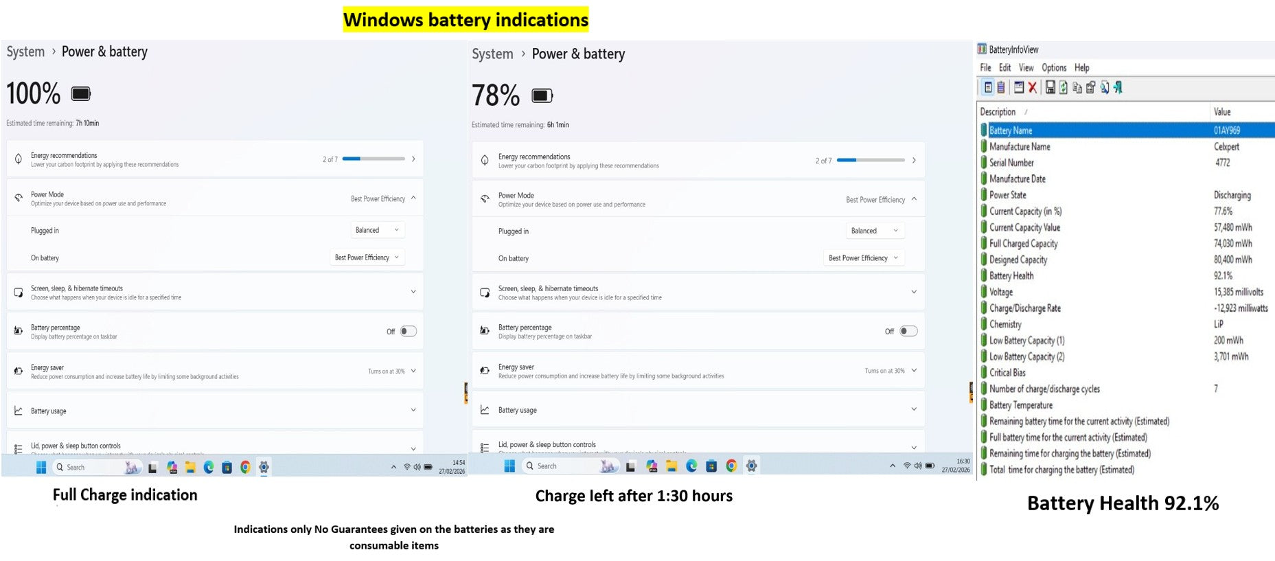 This model has one internal 80Wh battery, Windows has indicated 7:10 after a full charge the laptop has then been left to run on the battery without been allowed to sleep or hibernate or turn the screen off for 1:30 hours after which Windows indicated 6:01 remaining @ 78% capacity. The Battery Info View tool is also used to obtain the readings of the battery health which is 92.1% as shown in the last picture in the product photos. This will vary depending on usage and settings and is an indication only I offer no guarantees on the battery as it is a used consumable item