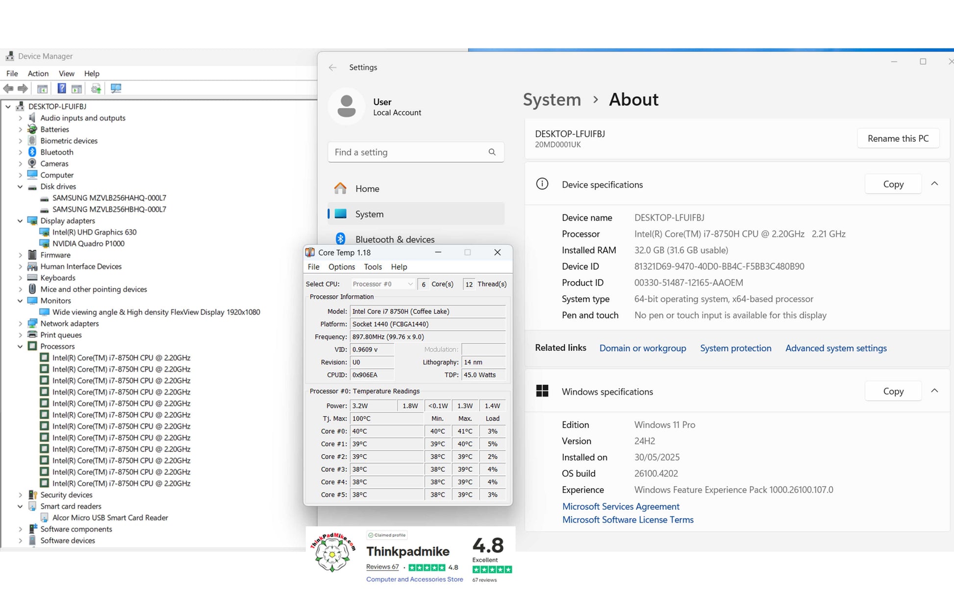 The internal fans has been removed and cleaned/ hoovered then new thermal paste applied to the heat sinks to ensure of a cool quiet running experience as you can see from the good processor temperature reading via the Core Temp App shown in the product picture. The motherboard is checked for any signs of liquid spills hoovered and sprayed with compressed air to remove any dust or debris. The keyboard has been fully tested hoovered and cleaned with a sanitizer solution using a toothbrush to remove any dirt and grime! All exteriors of the laptop are then cleaned with a sanitizer solution using a microfiber cloth. The screen is cleaned using a non-smear solution and a specialized LCD screen cleaning cloth. All ports are checked and tested as working.