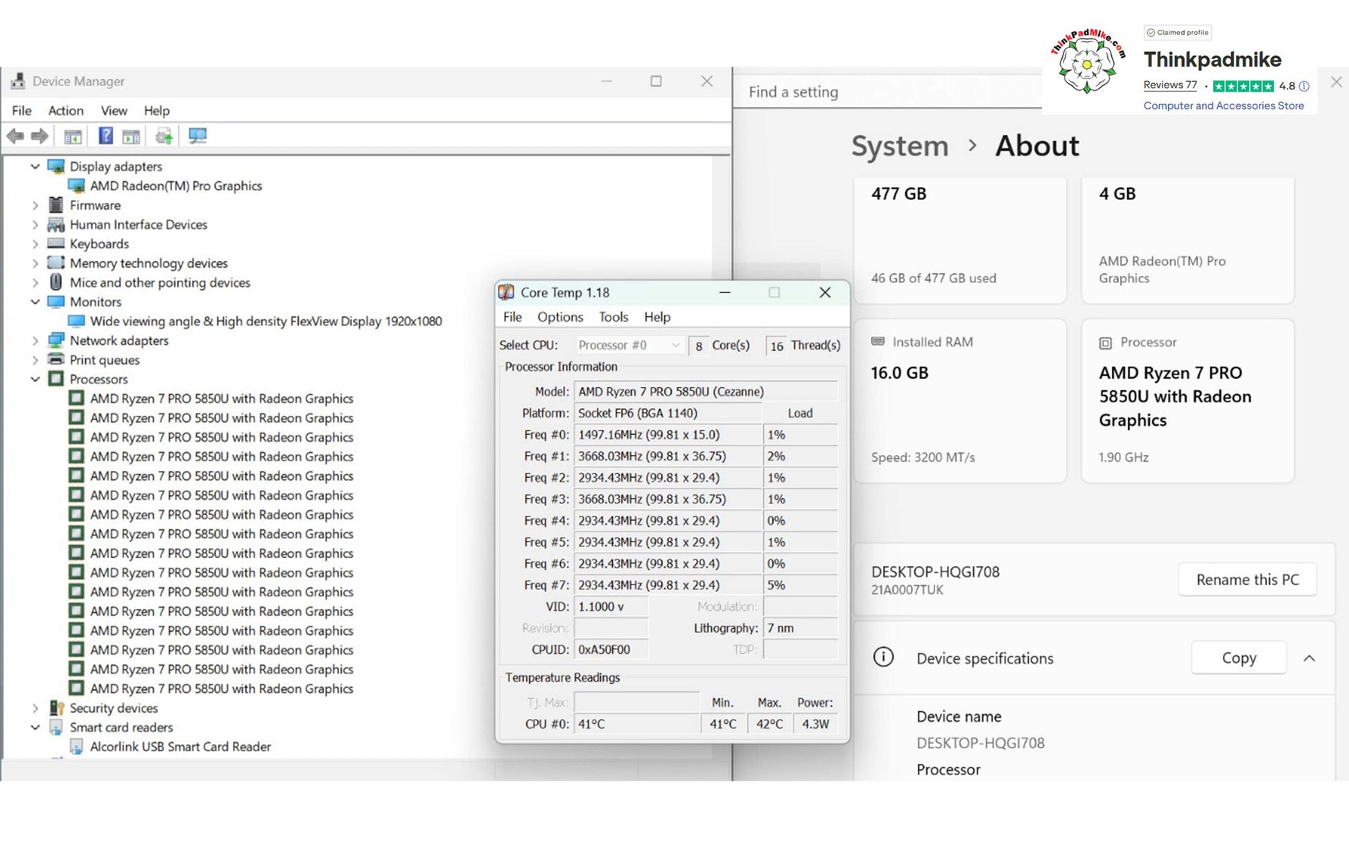Processor - AMD Ryzen 7 Pro 5850U 8 Core 16 threads 1.9Ghz to 4.4Ghz (Cezanne Socket FP6)
