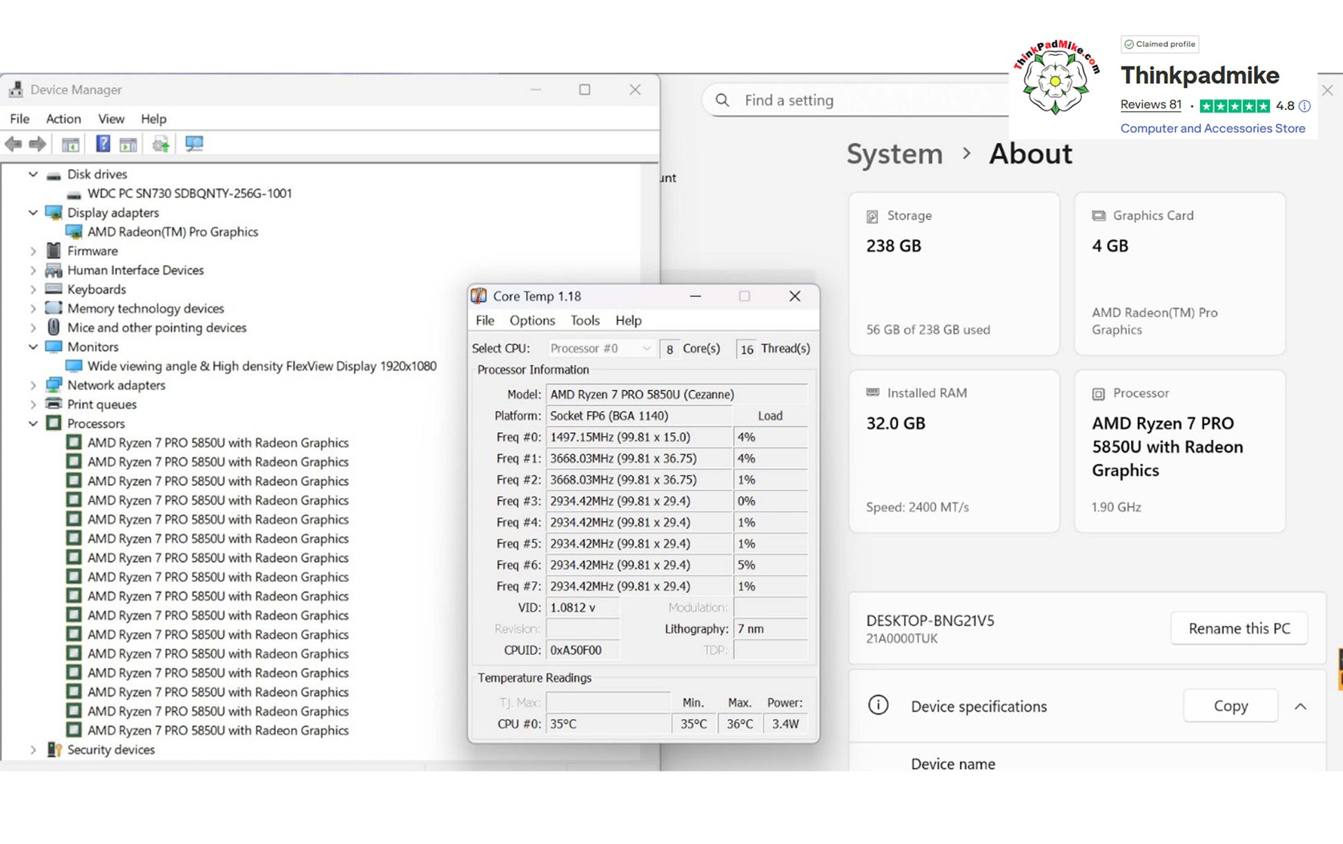 Processor - AMD Ryzen 7 Pro 5850U 8 Core 16 threads 1.9Ghz to 4.4Ghz (Cezanne Socket FP6)