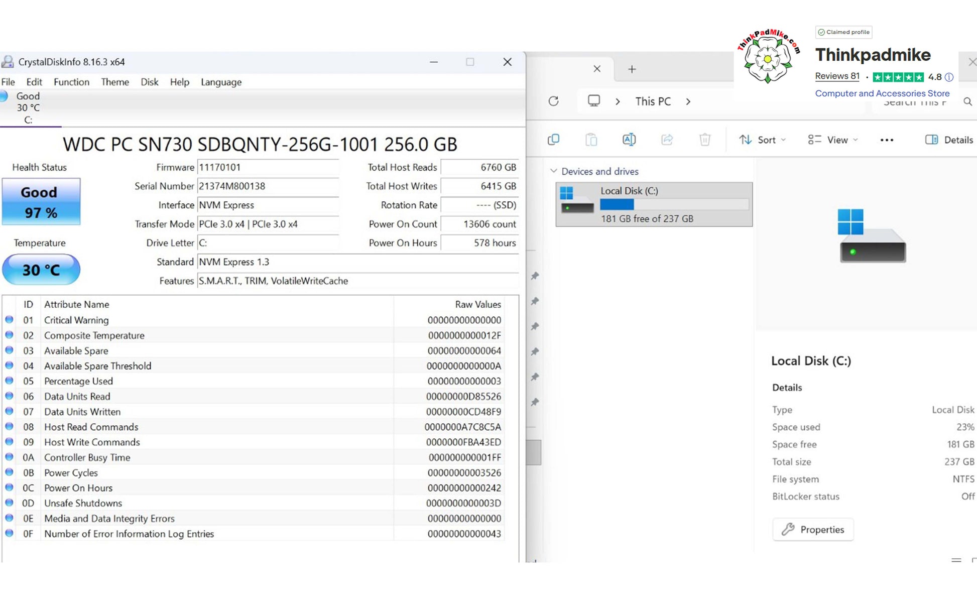 The SSD has been checked using the Crystal Disk application and as you can see in the product picture, it reports Good health and a good temperature . The laptop then has a full diagnostic scan to ensure there are no failings or issues, as you will see in the video it passed without any issues. It is then left to run for at least 24 hours without been allowed to sleep or hibernate to ensure no issues develop.