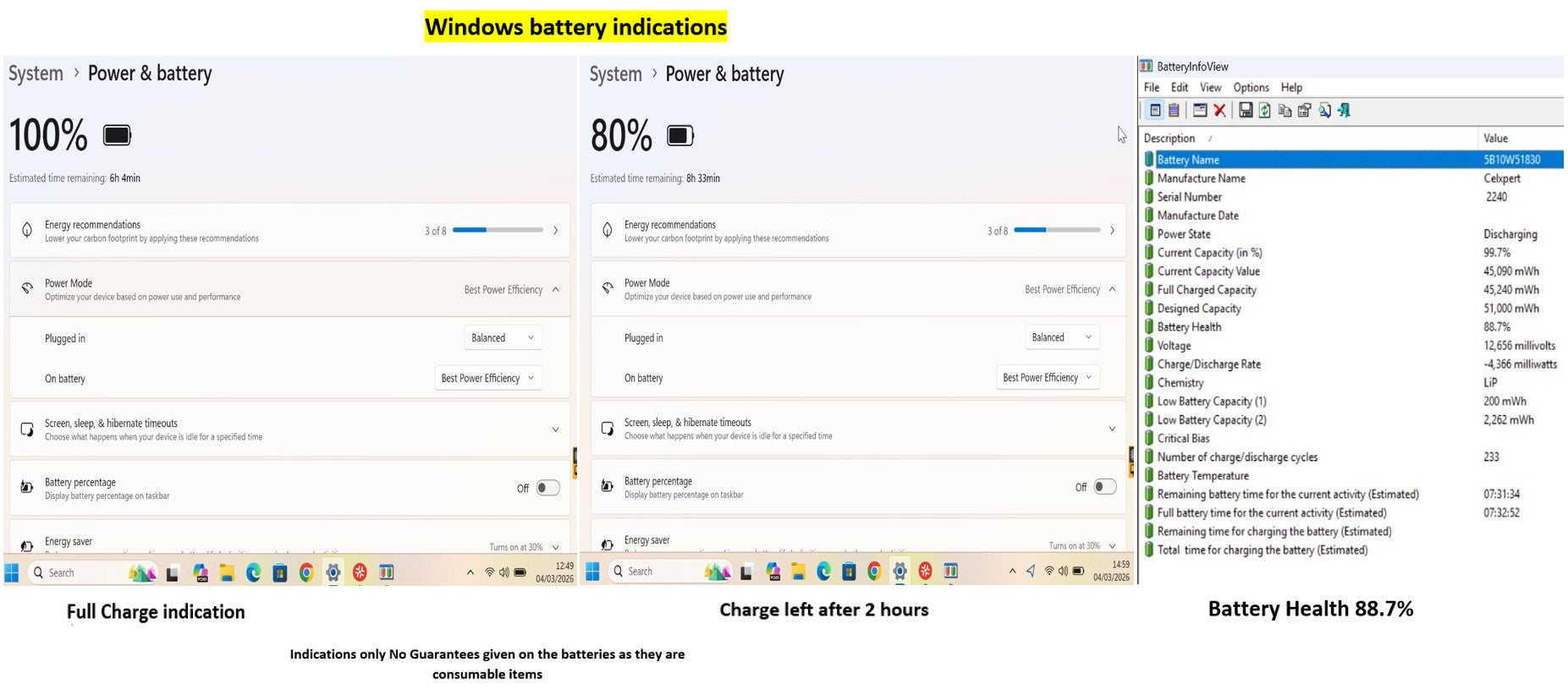 This model has one internal 50Wh battery, Windows has indicated 6:04 after a full charge the laptop has then been left to run on the battery without been allowed to sleep or hibernate or turn the screen off for 2 hours after which Windows indicated 8:33 remaining @ 80% capacity. The Battery Info View tool is also used to obtain the readings of the battery health which is 88.7% as shown in the last product picture & video . This will vary depending on usage and settings and is an indication only I offer no guarantees on the battery as it is a used consumable item.