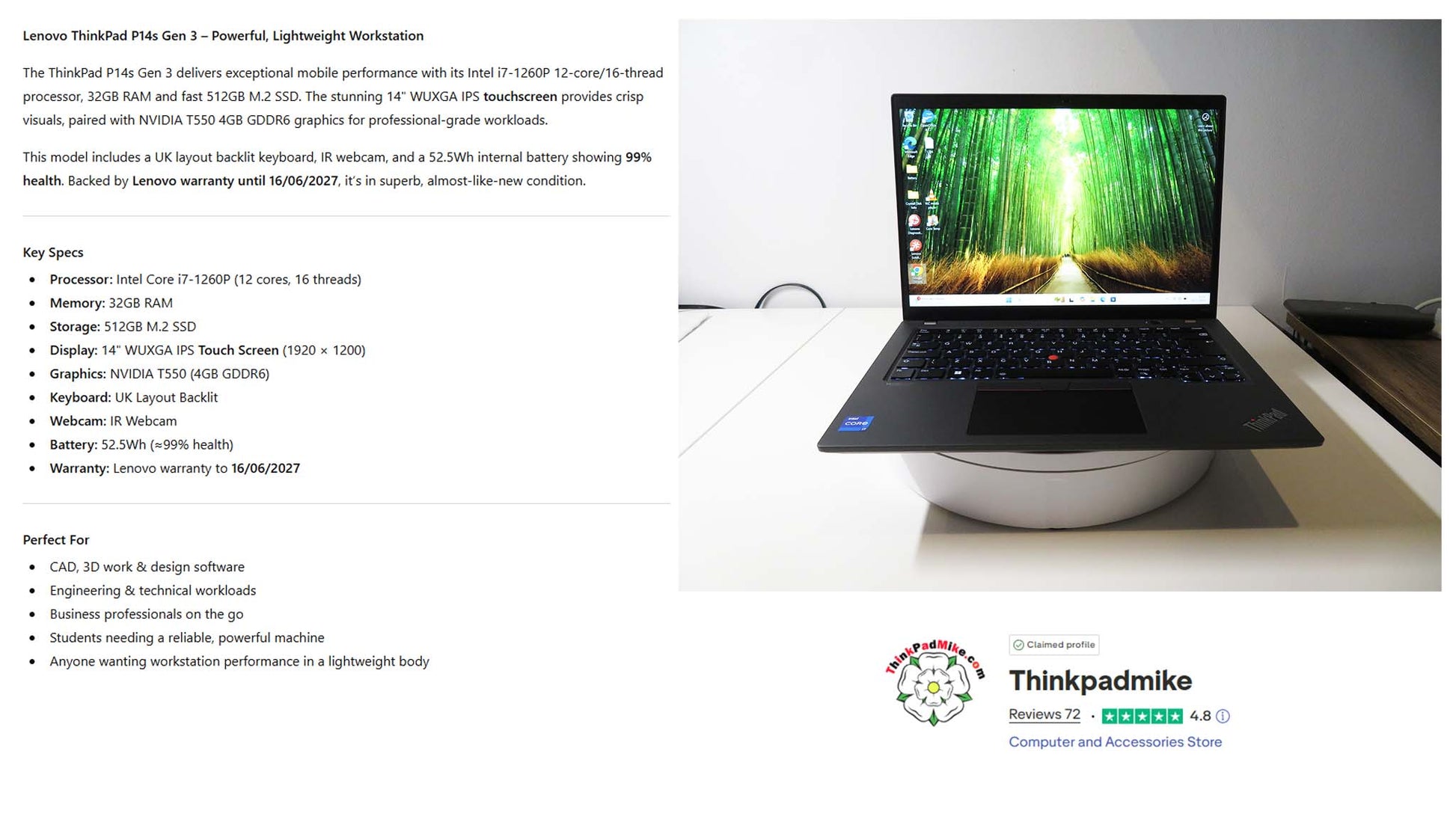 Lenovo ThinkPad P14s i7 1260P **12 Core** 32GB RAM 512GB SSD IPS TOUCH NVIDIA T550 WIN11 (1244)
