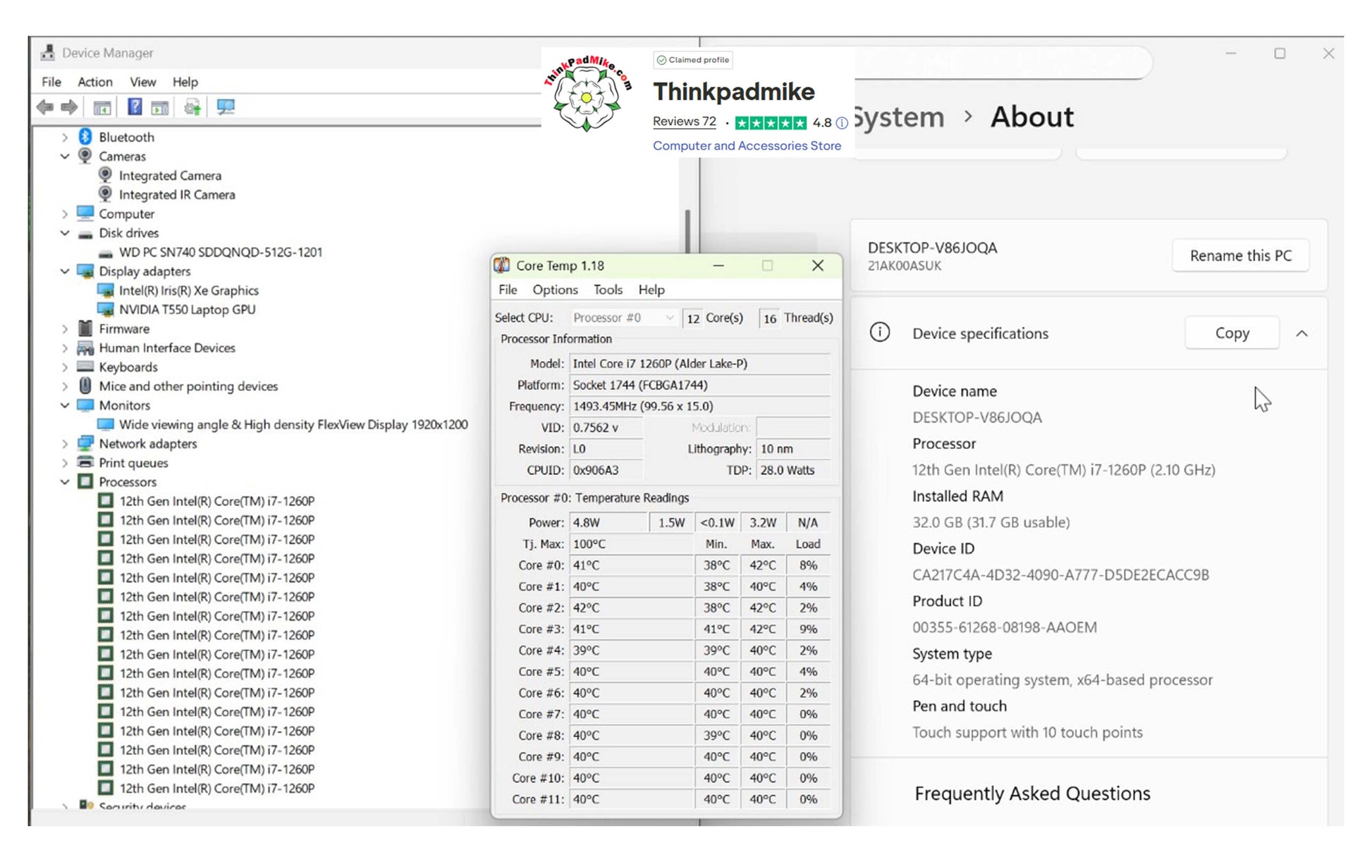 Processor - Intel i7 1260P 2.2Ghz to 4.8Ghz 18MB Smart Cache **12 cores 16 threads** (Alder Lake-P Socket 1744)