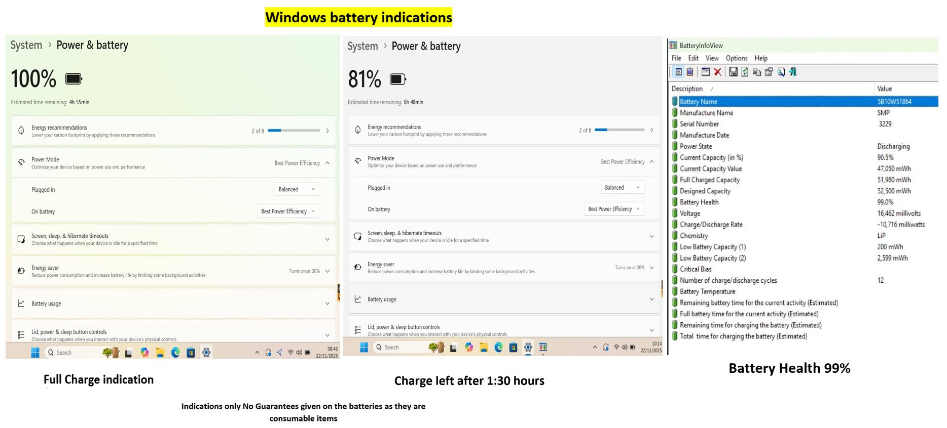 This model has one internal 52.5Wh battery, Windows has indicated 4:55 after a full charge the laptop has then been left to run on the battery without been allowed to sleep or hibernate or turn the screen off for 1:30 hours after which Windows indicated 6:48 remaining @ 81% capacity. The Battery Info View tool is also used to obtain the readings of the battery health which is 99% as shown in the last product picture & video . This will vary depending on usage and settings and is an indication only I offer no guarantees on the battery as it is a used consumable item.