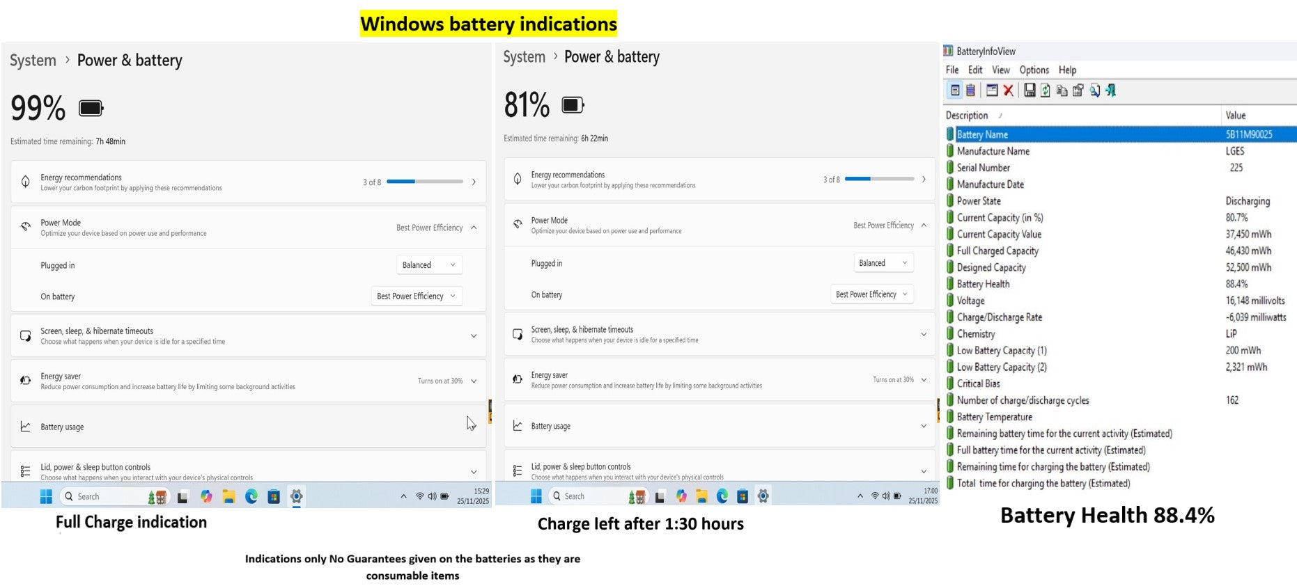 This model has one internal 52.5Wh battery, Windows has indicated 7:48 after a full charge the laptop has then been left to run on the battery without been allowed to sleep or hibernate or turn the screen off for 1:30 hours after which Windows indicated 6:22 remaining @ 81% capacity. The Battery Info View tool is also used to obtain the readings of the battery health which is 88.4% as shown in the last product picture & video . This will vary depending on usage and settings and is an indication only I offer no guarantees on the battery as it is a used consumable item.