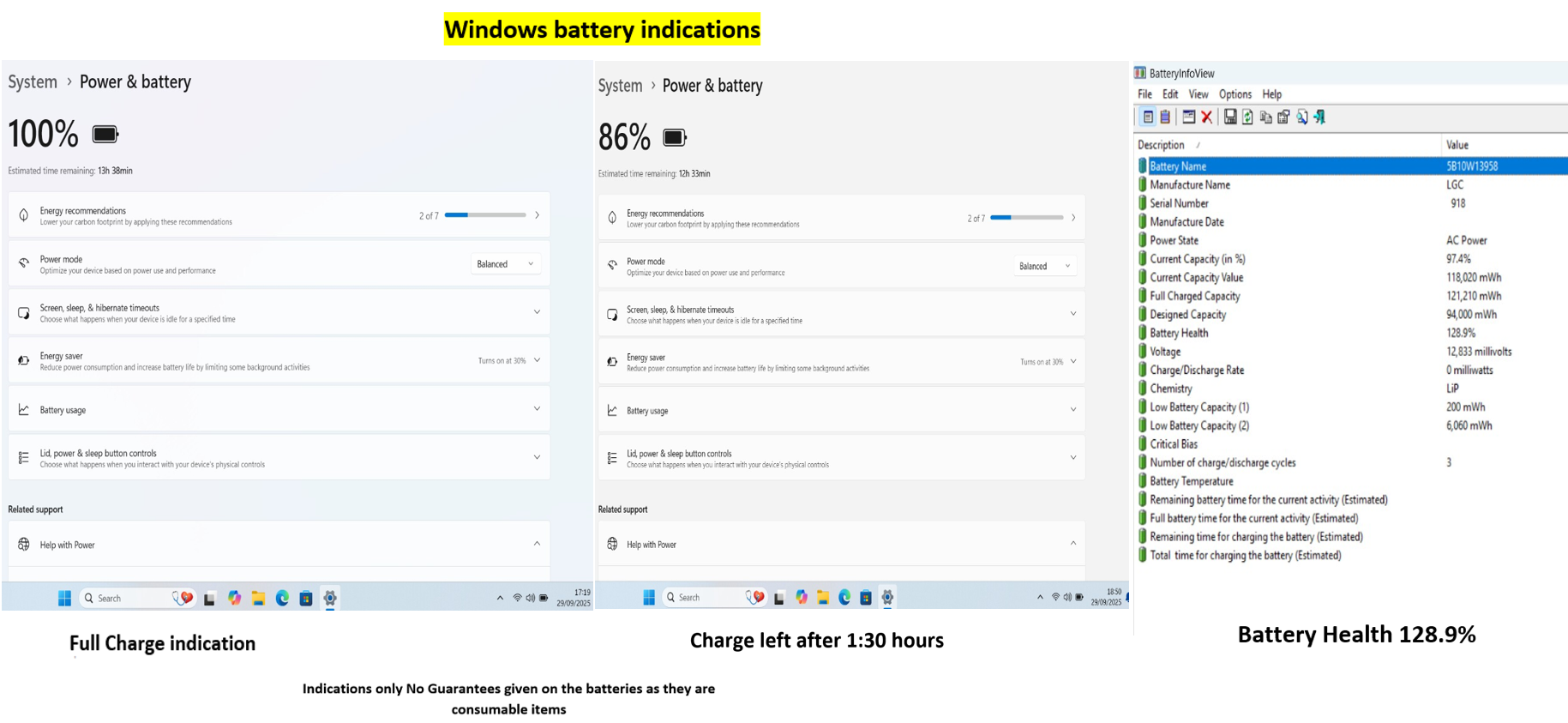 This model has one internal 94Wh battery, Windows has indicated 13:38 after a full charge the laptop has then been left to run on the battery without been allowed to sleep or hibernate or turn the screen off for 1:30 hours after which Windows indicated 12:33 hours remaining @ 86% capacity. The Battery Info View tool is also used to obtain the readings of the battery health which is 128.9% as shown in the last product picture & video . This will vary depending on usage and settings and is an indication only I offer no guarantees on the battery as it is a used consumable item.