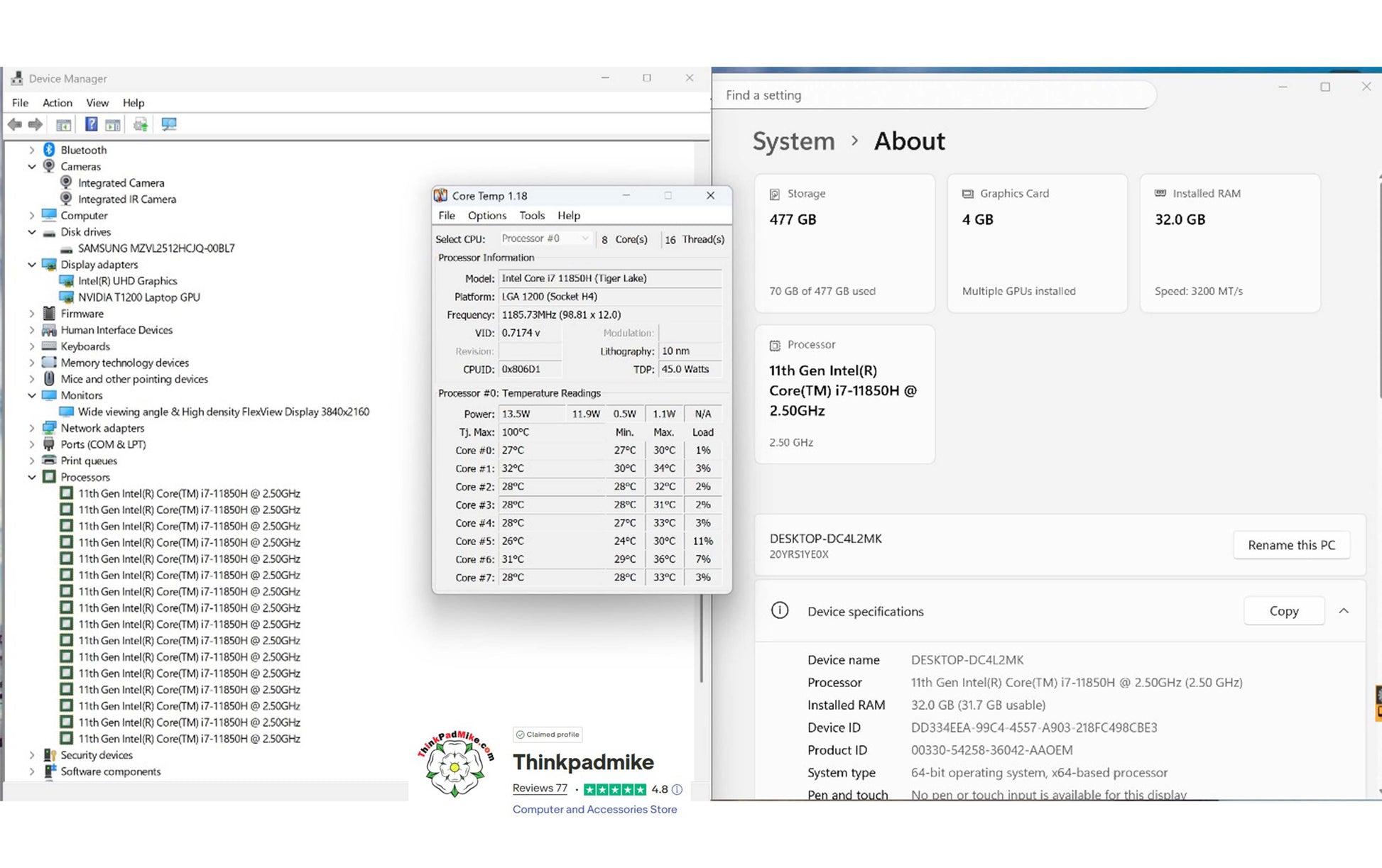 Processor - Intel i7 11850H 2.5Ghz to 4.8Ghz 24MB Smart Cache **8 cores 16 threads** (Tiger Lake LGA 1200)