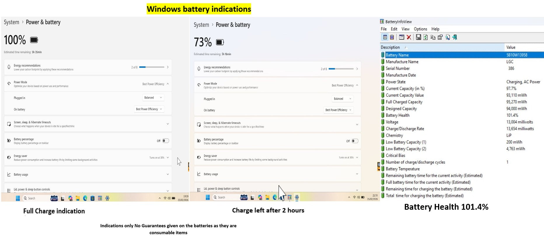 This model has one internal 94Wh battery, Windows has indicated 5:35 after a full charge the laptop has then been left to run on the battery without been allowed to sleep or hibernate or turn the screen off for 2 hours after which Windows indicated 5:16 hours remaining @ 73% capacity. The Battery Info View tool is also used to obtain the readings of the battery health which is 101.4% as shown in the last product picture & video . This will vary depending on usage and settings and is an indication only I offer no guarantees on the battery as it is a used consumable item.