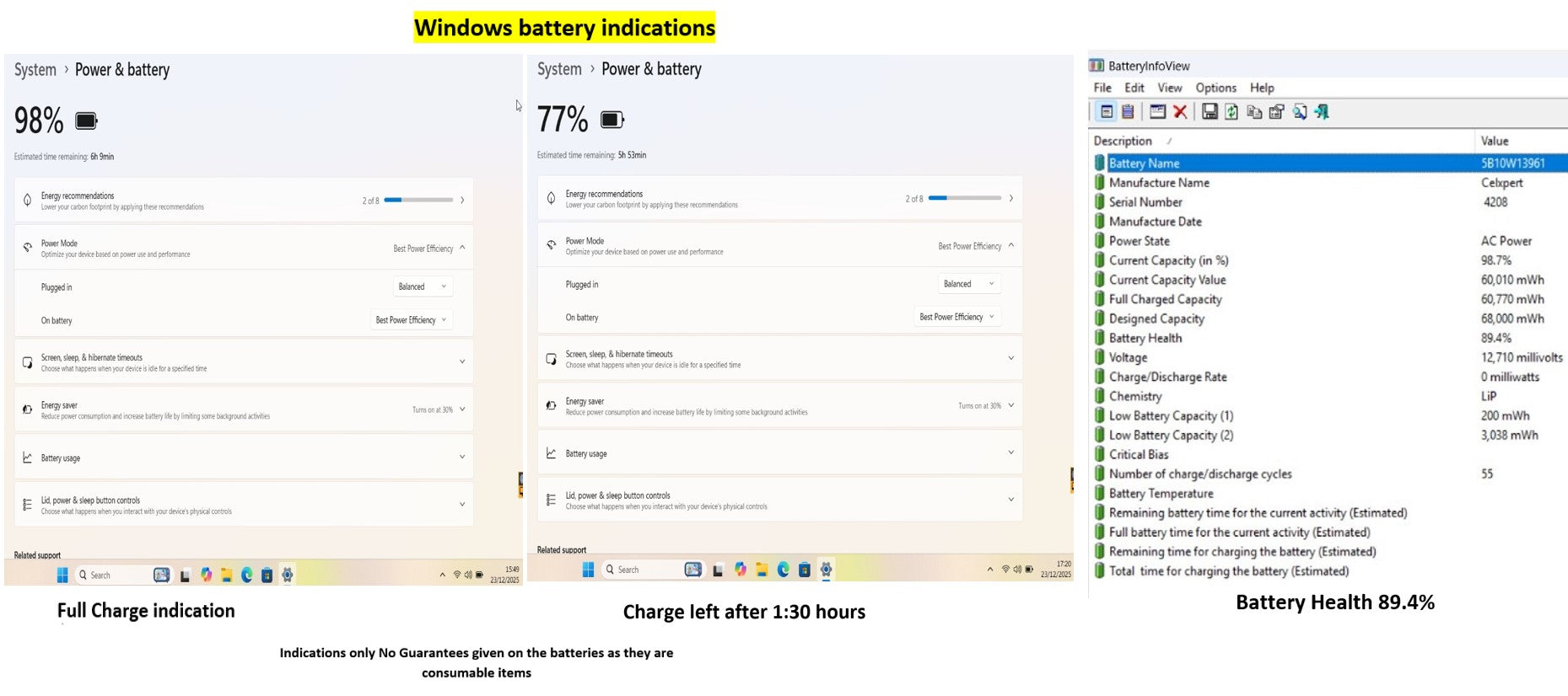 This model has one internal 68Wh battery, Windows has indicated 6:09 after a full charge the laptop has then been left to run on the battery without been allowed to sleep or hibernate or turn the screen off for 1:30 hours after which Windows indicated 5:53 remaining @ 77% capacity. The Battery Info View tool is also used to obtain the readings of the battery health which is 89.4% as shown in the last product picture & video . This will vary depending on usage and settings and is an indication only I offer no guarantees on the battery as it is a used consumable item.