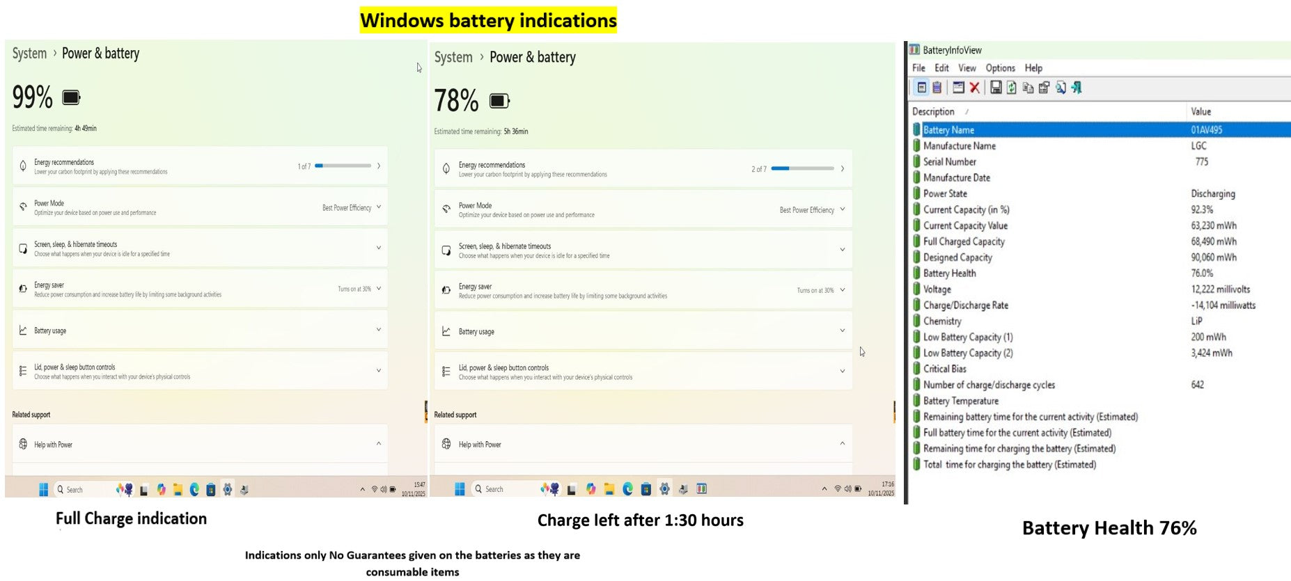 This model has one external 90Wh battery, Windows has indicated 4:49 after a full charge the laptop has then been left to run on the battery without been allowed to sleep or hibernate or turn the screen off for 1:30 hours after which Windows indicated 5:36 remaining @ 78% capacity. The Battery Info View tool is also used to obtain the readings of the battery health which is 76% as shown in the last picture in the product photos. This will vary depending on usage and settings and is an indication only I offer no guarantees on the battery as it is a used consumable item