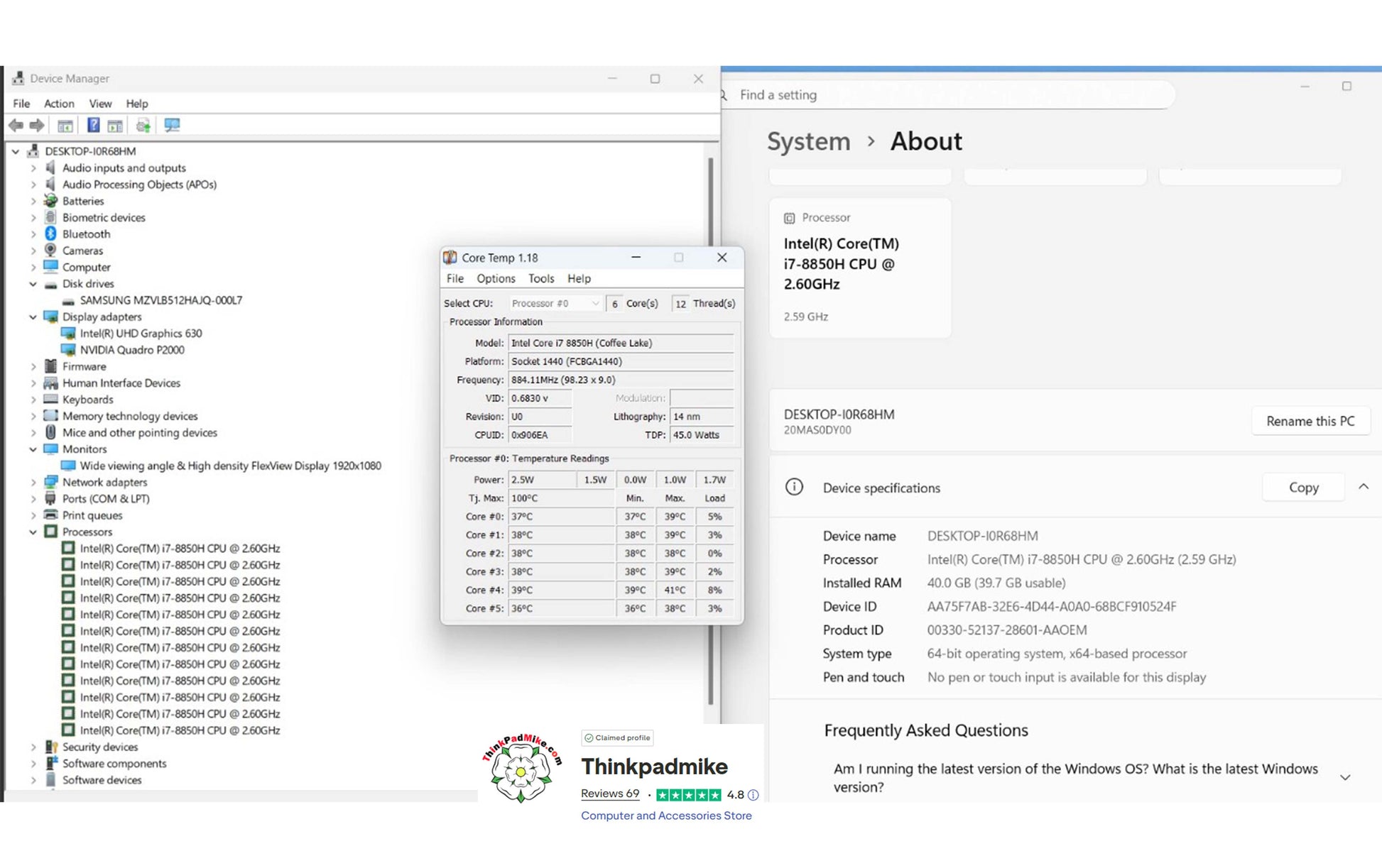 Processor - Intel i7 8850H 2.6Ghz to 4.3Ghz 9MB Cache **6 cores 12 threads** (Coffee Lake Socket 1440)