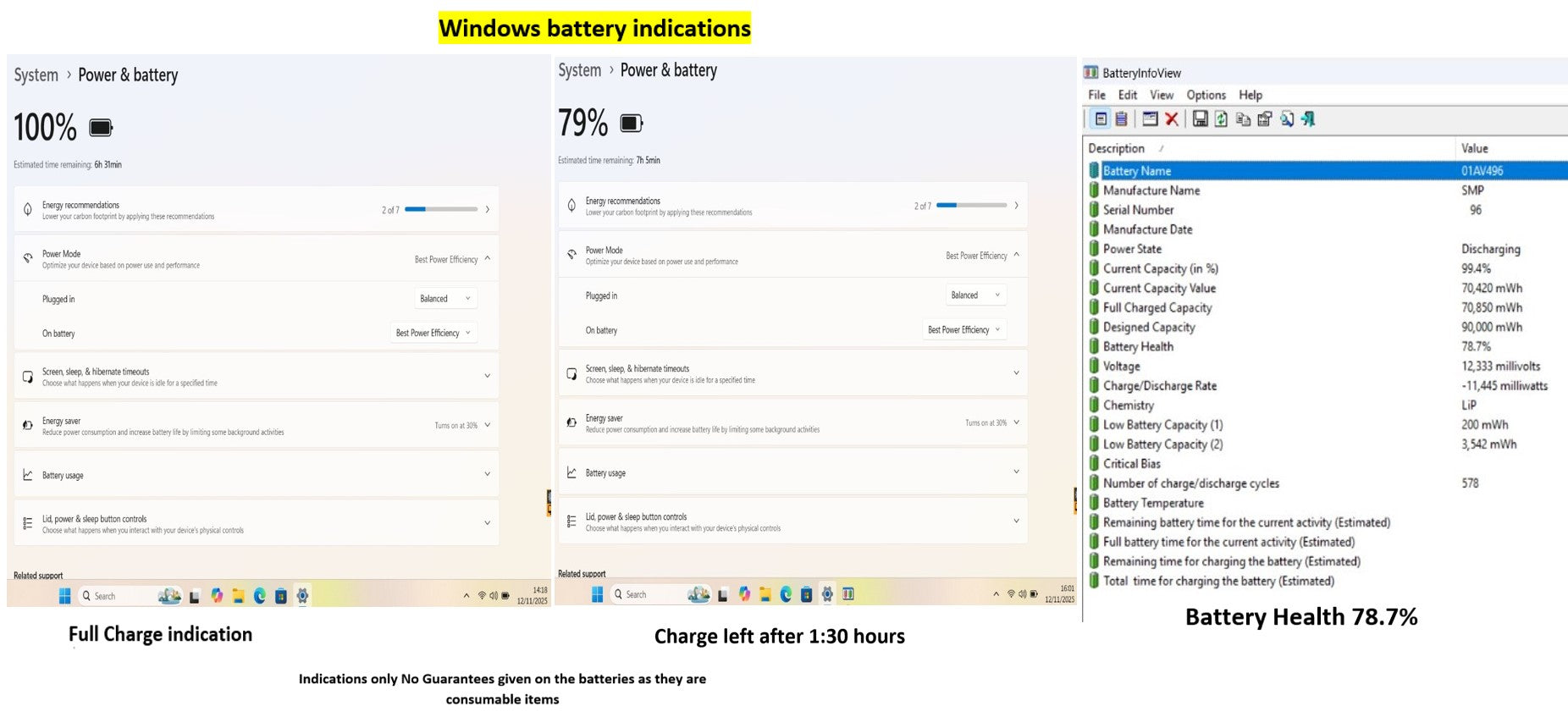 This model has one external 90Wh battery, Windows has indicated 6:31 after a full charge the laptop has then been left to run on the battery without been allowed to sleep or hibernate or turn the screen off for 1:30 hours after which Windows indicated 7:05 remaining @ 79% capacity. The Battery Info View tool is also used to obtain the readings of the battery health which is 78.7% as shown in the last picture in the product photos. This will vary depending on usage and settings and is an indication only I offer no guarantees on the battery as it is a used consumable item