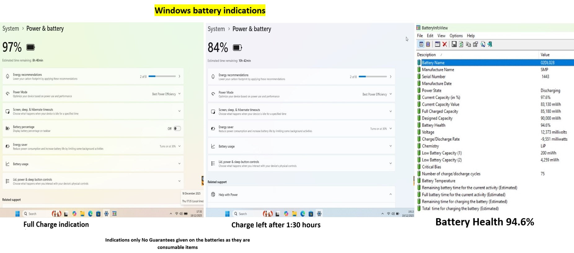 This model has one internal 90Wh battery, Windows has indicated 8:40 after a full charge the laptop has then been left to run on the battery without been allowed to sleep or hibernate or turn the screen off for 1:30 hours after which Windows indicated 10:42 hours remaining @ 84% capacity. The Battery Info View tool is also used to obtain the readings of the battery health which is 94.6% as shown in the last picture in the product photos. This will vary depending on usage and settings and is an indication only I offer no guarantees on the battery as it is a used consumable item