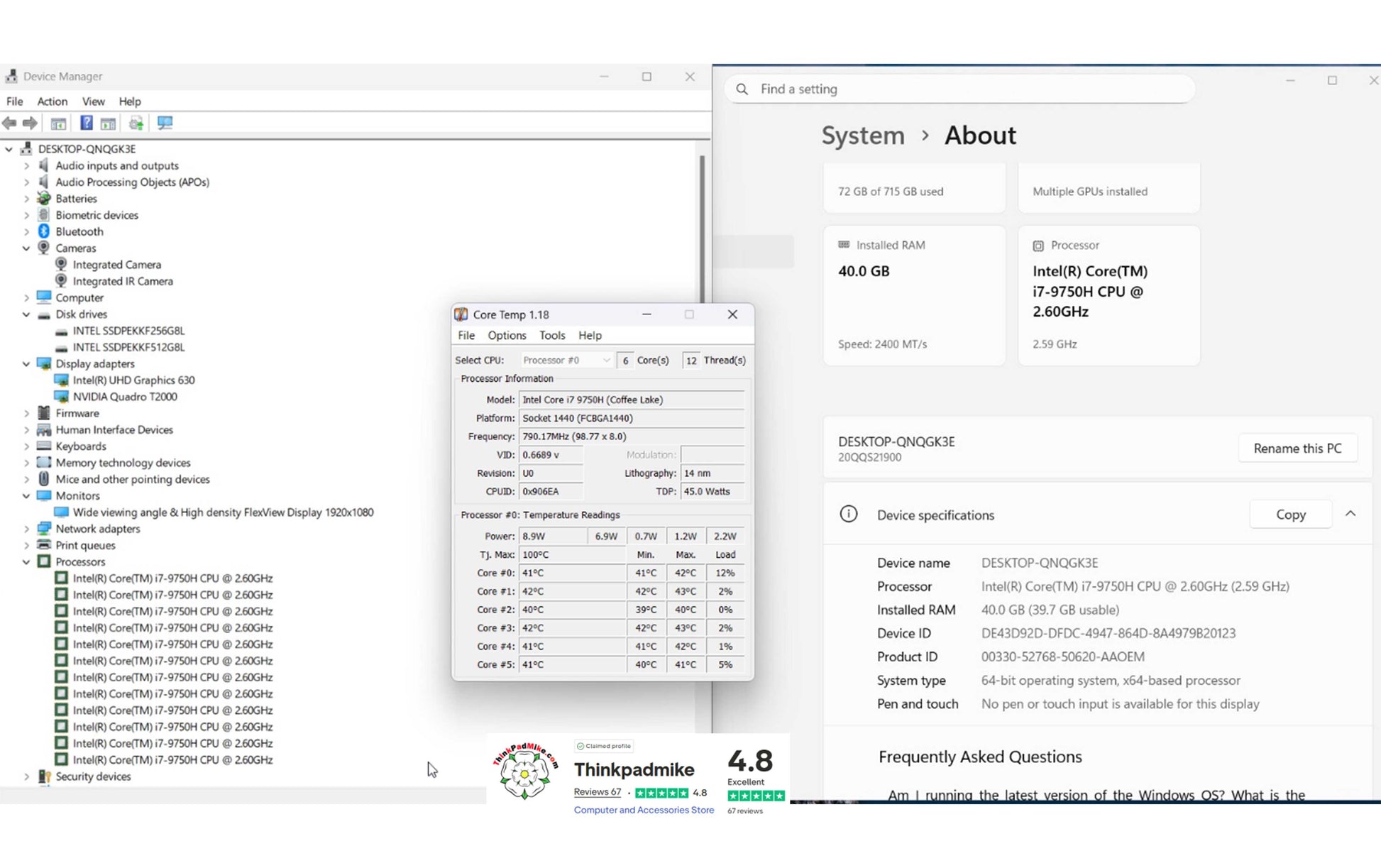 Lenovo ThinkPad P53 i7 *HEX CORE* 9750H 2.6Ghz 40GB RAM 256GB + 512GB IPS B\L KB NVIDIA T2000 (1208)