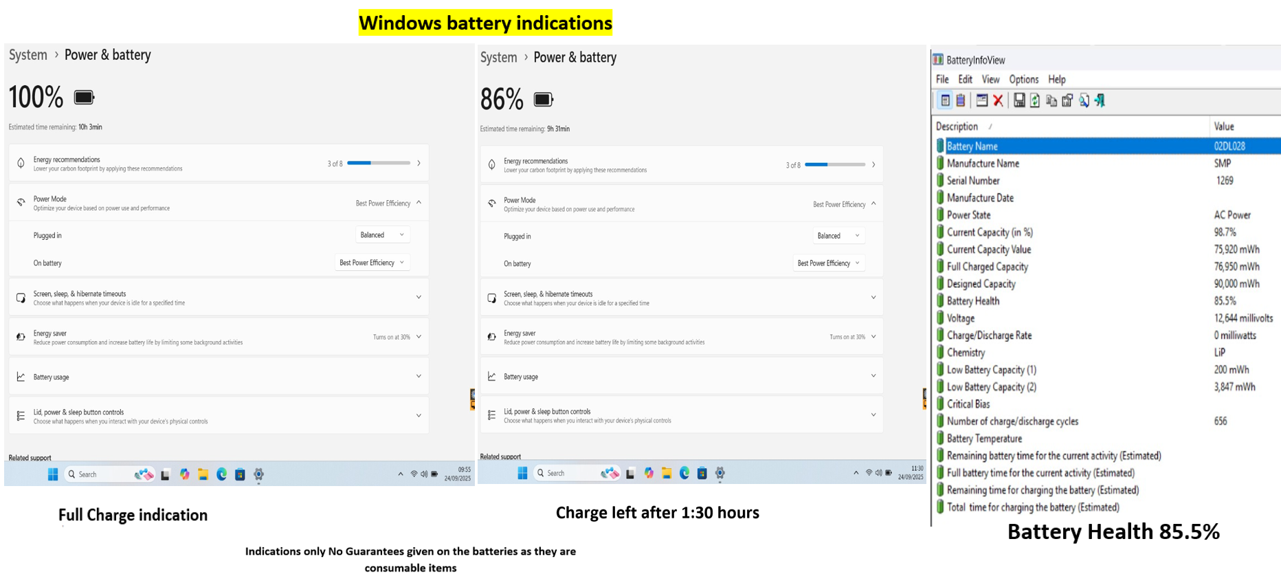 This model has one internal 90Wh battery, Windows has indicated 10:03 after a full charge the laptop has then been left to run on the battery without been allowed to sleep or hibernate or turn the screen off for 1:30 hours after which Windows indicated 9:31 hours remaining @ 86% capacity. The Battery Info View tool is also used to obtain the readings of the battery health which is 85.5% as shown in the last picture in the product photos. This will vary depending on usage and settings and is an indication only I offer no guarantees on the battery as it is a used consumable item
