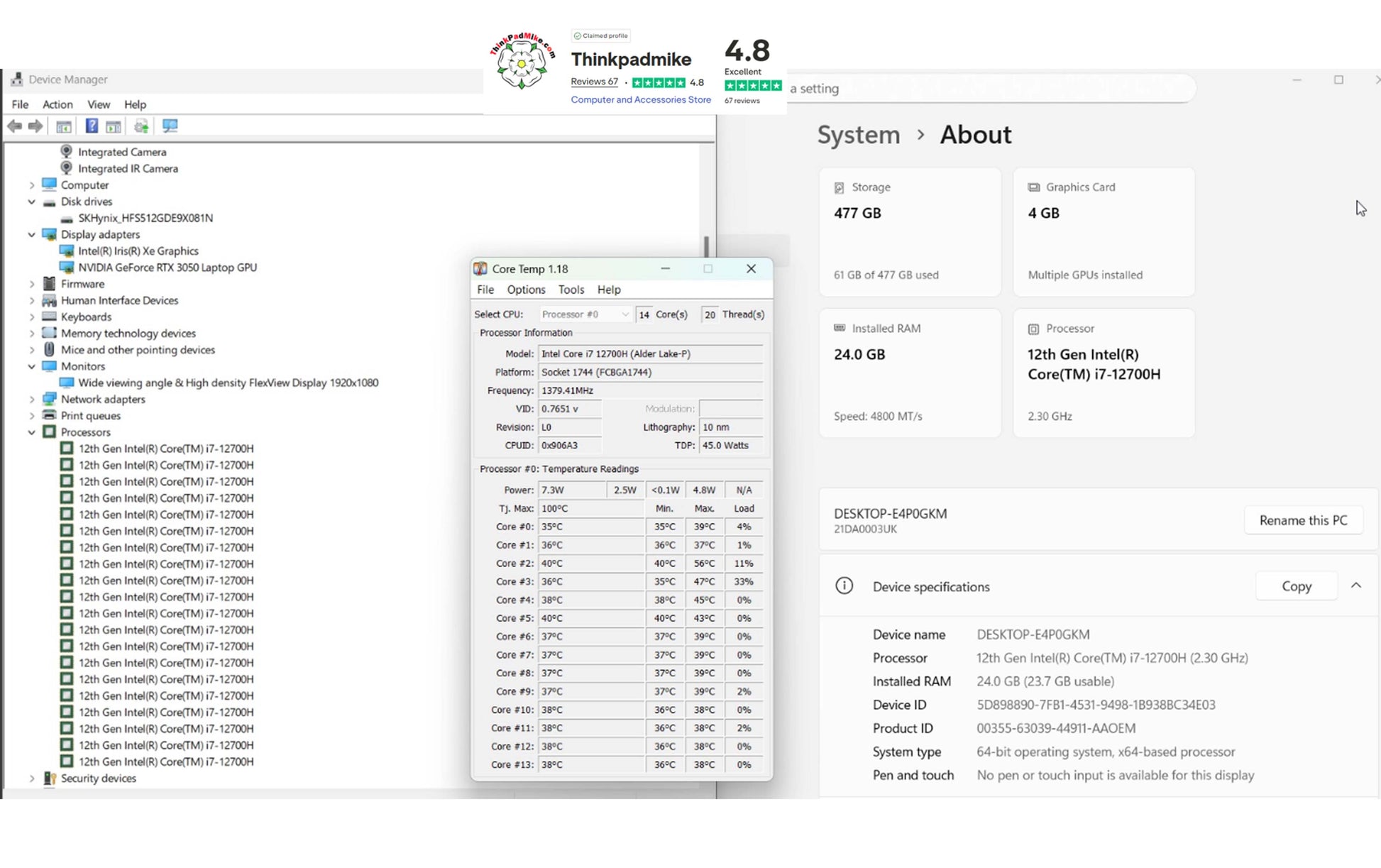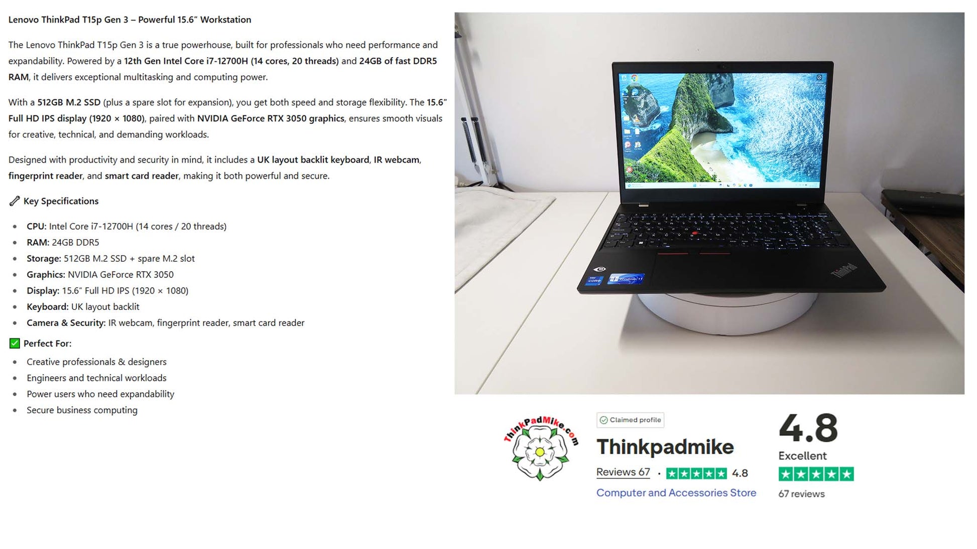 Lenovo ThinkPad T15p Gen 3 – i7-12700H | 24GB DDR5 RAM | 512GB SSD (+ spare M.2 slot) | 15.6″ IPS FHD | RTX 3050 | Backlit UK Keyboard | IR Webcam | Fingerprint & Smart Card Reader