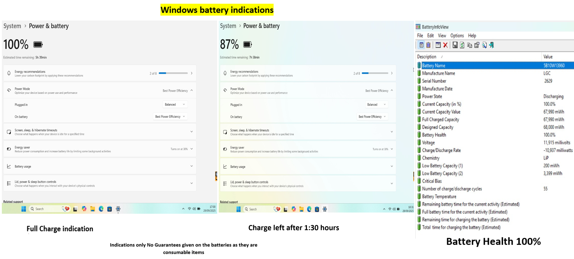 This model has one internal 68Wh battery, Windows has indicated 5:39 after a full charge the laptop has then been left to run on the battery without been allowed to sleep or hibernate or turn the screen off for 1:30 hours after which Windows indicated 7:58 remaining @ 87% capacity. The Battery Info View tool is also used to obtain the readings of the battery health which is 100% as shown in the last product picture & video . This will vary depending on usage and settings and is an indication only I offer no guarantees on the battery as it is a used consumable item.