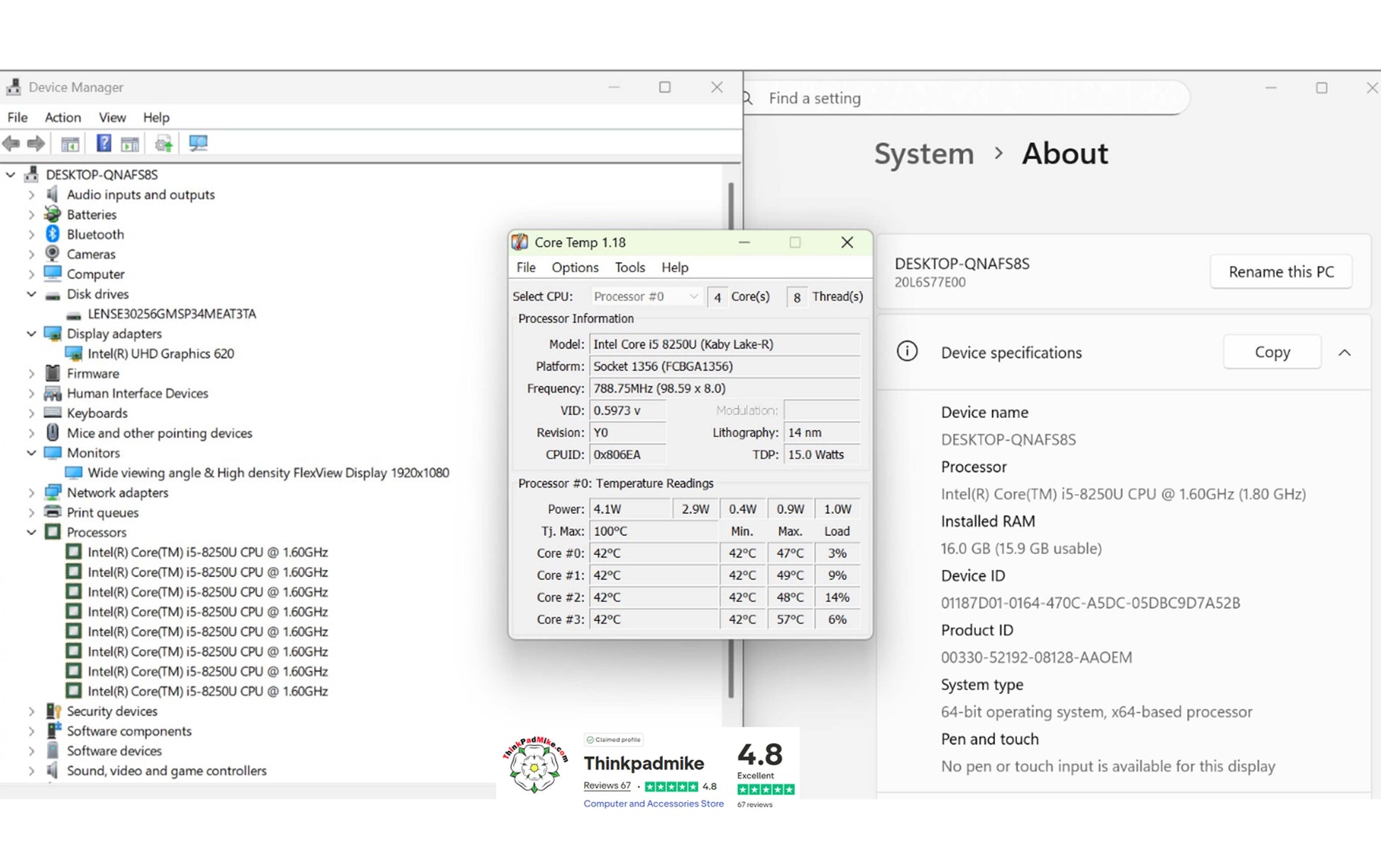 The internal fan has been removed cleaned, hoovered then new thermal paste applied to the heatsink, fan re-seated and sprayed with compressed air to ensure of a cool quiet running experience as you can see from the good processor temperature reading via the Core Temp App. The motherboard is checked for any signs of liquid spills and sprayed with compressed air to remove any dust or debris. The keyboard has been fully tested and cleaned with a sanitizer solution to remove any dirt and grime! All exteriors of the laptop are then cleaned with a sanitizer solution using a microfiber cloth. The screen is cleaned using a non-smear solution and a specialized LCD screen cleaning cloth. All ports are checked and tested as working.