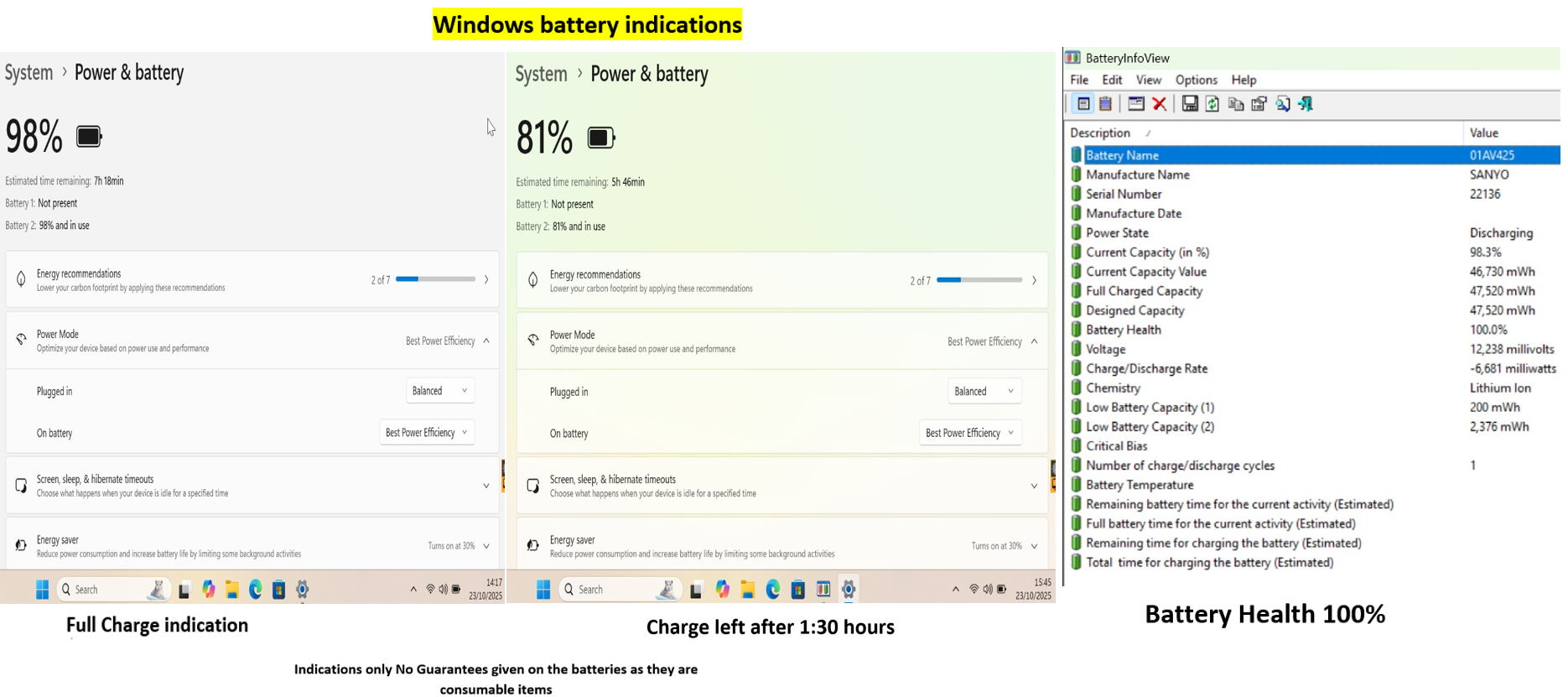 This model has a replacement external 6 cell battery (no internal battery) Windows has indicated 7:18 after a full charge, the laptop has then been left to run on the batteries for 1:30 hours after which Windows indicated 5:46 hours remaining @ 81%.