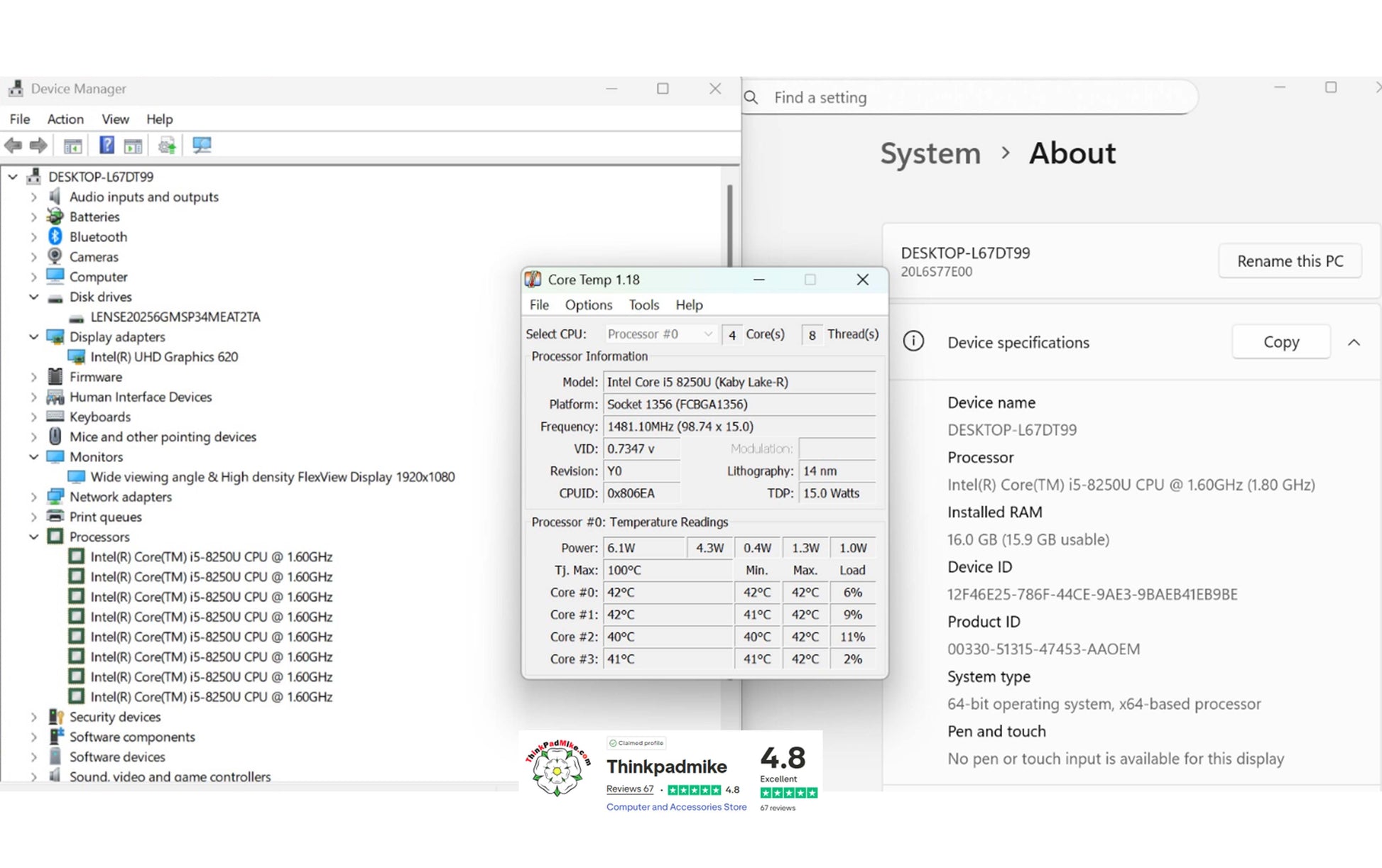 The internal fan has been removed cleaned, hoovered then new thermal paste applied to the heatsink, fan re-seated and sprayed with compressed air to ensure of a cool quiet running experience as you can see from the good processor temperature reading via the Core Temp App. The motherboard is checked for any signs of liquid spills and sprayed with compressed air to remove any dust or debris. The keyboard has been fully tested and cleaned with a sanitizer solution to remove any dirt and grime! All exteriors of the laptop are then cleaned with a sanitizer solution using a microfiber cloth. The screen is cleaned using a non-smear solution and a specialized LCD screen cleaning cloth. All ports are checked and tested as working.