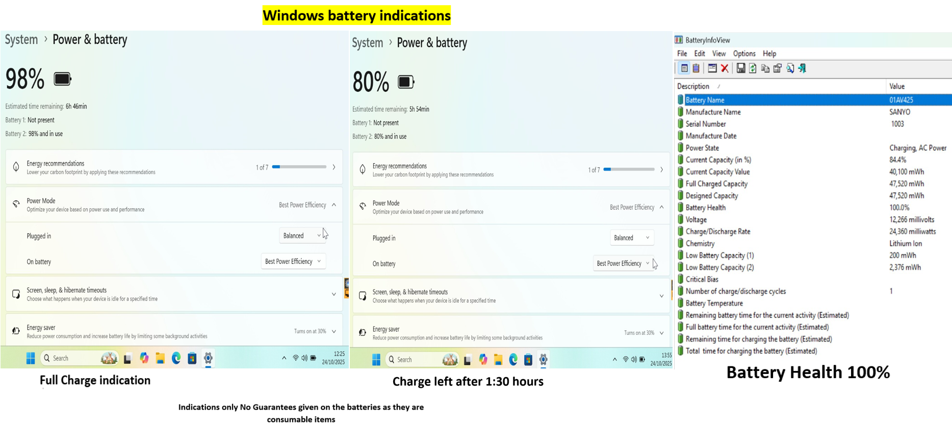 This model has a replacement external 6 cell battery (no internal battery) Windows has indicated 6:46 after a full charge, the laptop has then been left to run on the batteries for 1:30 hours after which Windows indicated 5:54 hours remaining @ 80%.