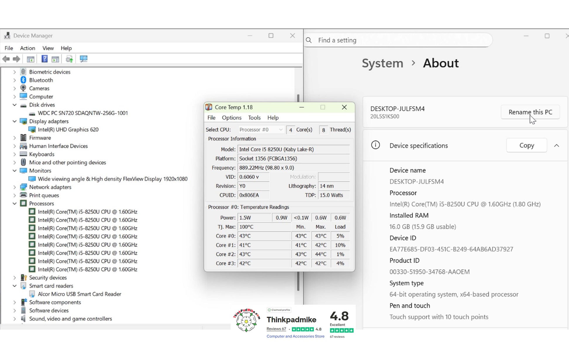 The internal fan has been removed cleaned, hoovered then new thermal paste applied to the heatsink, fan re-seated and sprayed with compressed air to ensure of a cool quiet running experience as you can see from the good processor temperature reading via the Core Temp App. The motherboard is checked for any signs of liquid spills and sprayed with compressed air to remove any dust or debris. The keyboard has been fully tested and cleaned with a sanitizer solution to remove any dirt and grime! All exteriors of the laptop are then cleaned with a sanitizer solution using a microfiber cloth. The screen is cleaned using a non-smear solution and a specialized LCD screen cleaning cloth. All ports are checked and tested as working.