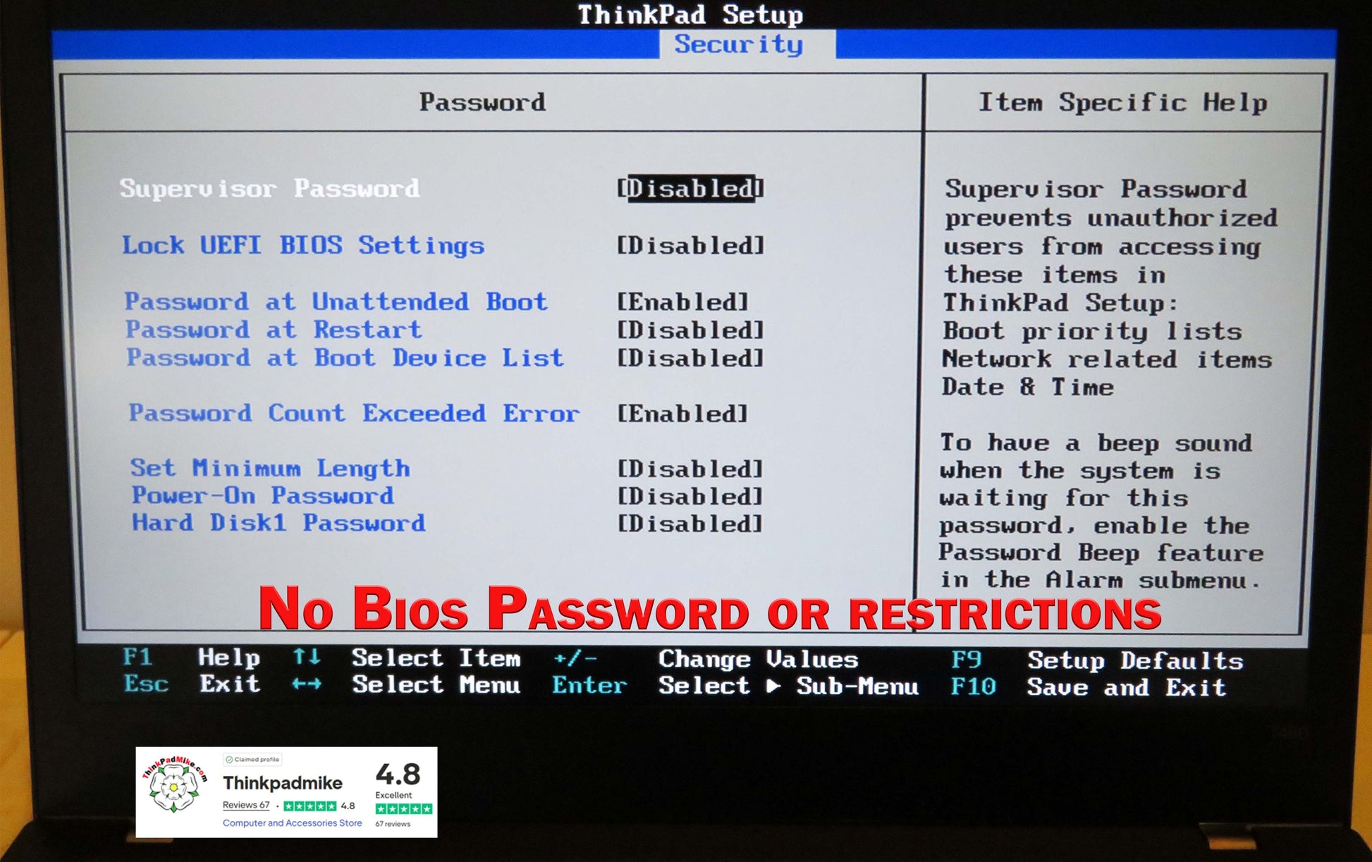 The BIOS of this laptop has no password set or restrictions, providing easy access and customization options.