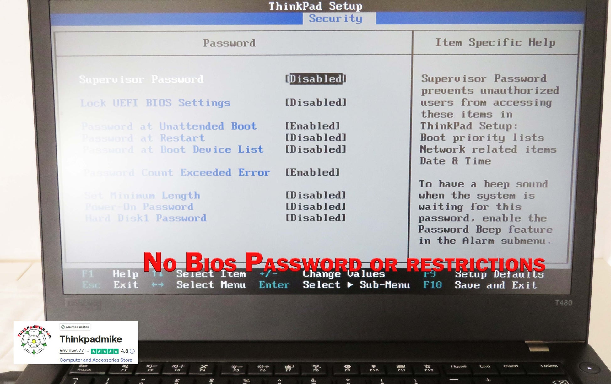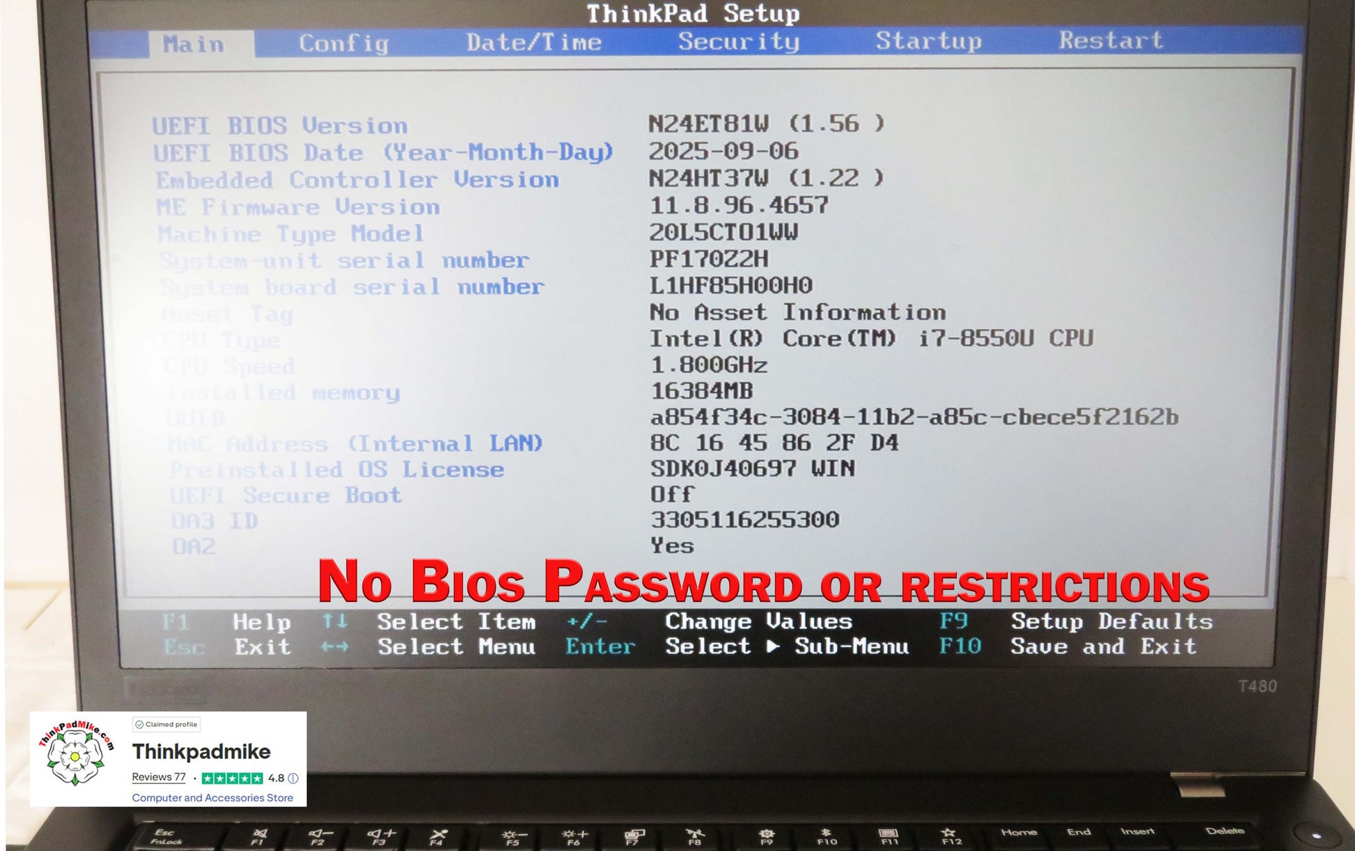 The BIOS of this laptop has no password set or restrictions, providing easy access and customization options.