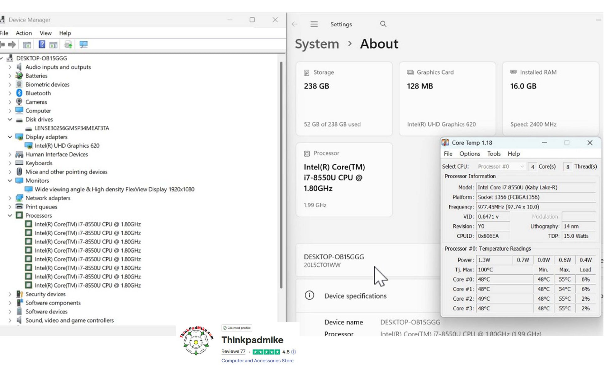 The internal fan has been removed cleaned, hoovered then new thermal paste applied to the heatsink, fan re-seated and sprayed with compressed air to ensure of a cool quiet running experience as you can see from the good processor temperature reading via the Core Temp App. The motherboard is checked for any signs of liquid spills and sprayed with compressed air to remove any dust or debris. The keyboard has been fully tested and cleaned with a sanitizer solution to remove any dirt and grime! All exteriors of the laptop are then cleaned with a sanitizer solution using a microfiber cloth. The screen is cleaned using a non-smear solution and a specialized LCD screen cleaning cloth. All ports are checked and tested as working.