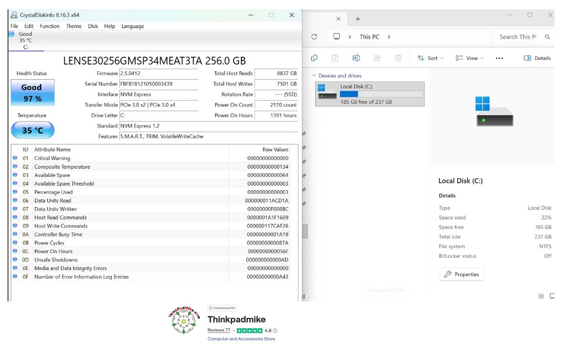 The SSD has been checked using the Crystal Disk Info application and it reports Good health and a good temperature as you can see. The laptop then has a full diagnostic scan to ensure there are no failings or issues, as you will see in the video it passed without any issues. It is then left to run for at least 24 hours (generally 48 hours) without been allowed to sleep or hibernate to ensure no issues develop.