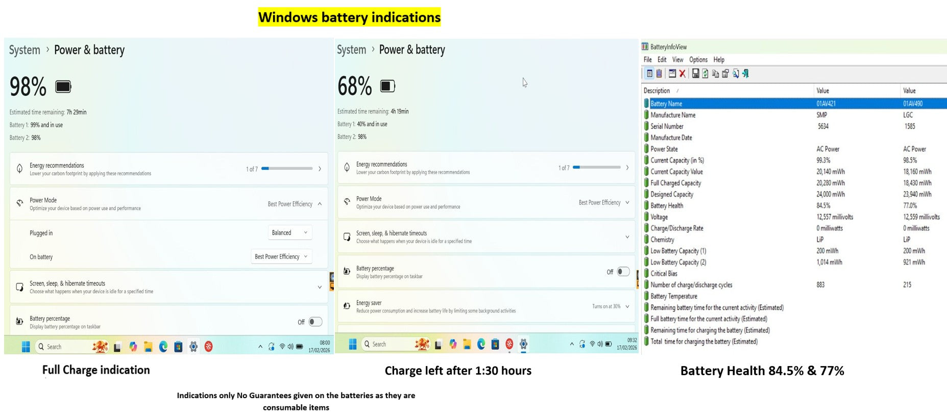 The batteries have also been scanned with the Battery Info View App which reports a battery health of 84.5% & 77% respectively.