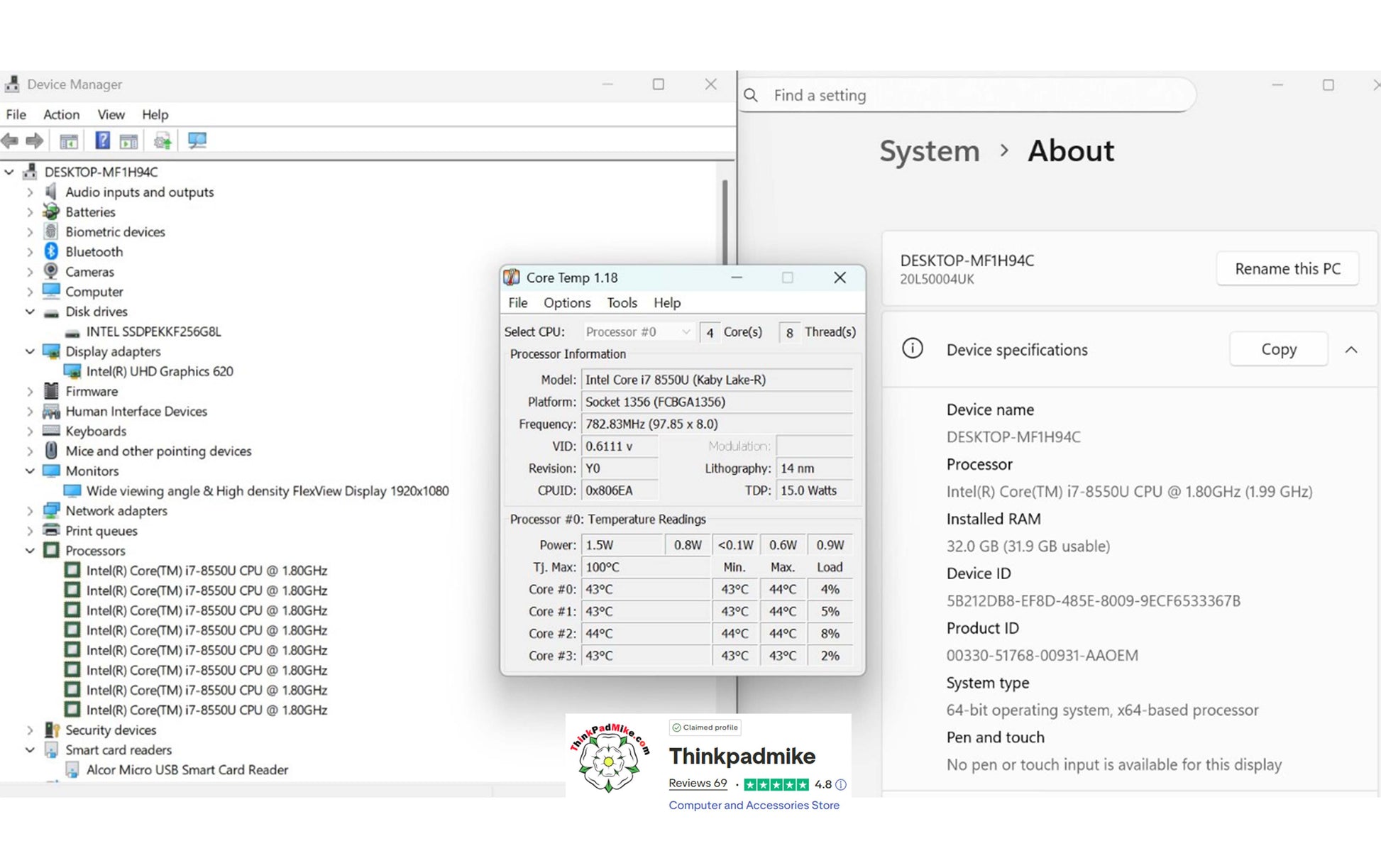The internal fan has been removed cleaned, hoovered then new thermal paste applied to the heatsink, fan re-seated and sprayed with compressed air to ensure of a cool quiet running experience as you can see from the good processor temperature reading via the Core Temp App. The motherboard is checked for any signs of liquid spills and sprayed with compressed air to remove any dust or debris. The keyboard has been fully tested and cleaned with a sanitizer solution to remove any dirt and grime! All exteriors of the laptop are then cleaned with a sanitizer solution using a microfiber cloth. The screen is cleaned using a non-smear solution and a specialized LCD screen cleaning cloth. All ports are checked and tested as working.