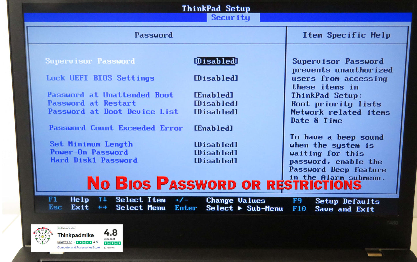 The BIOS of this laptop has no password set or restrictions, providing easy access and customization options.