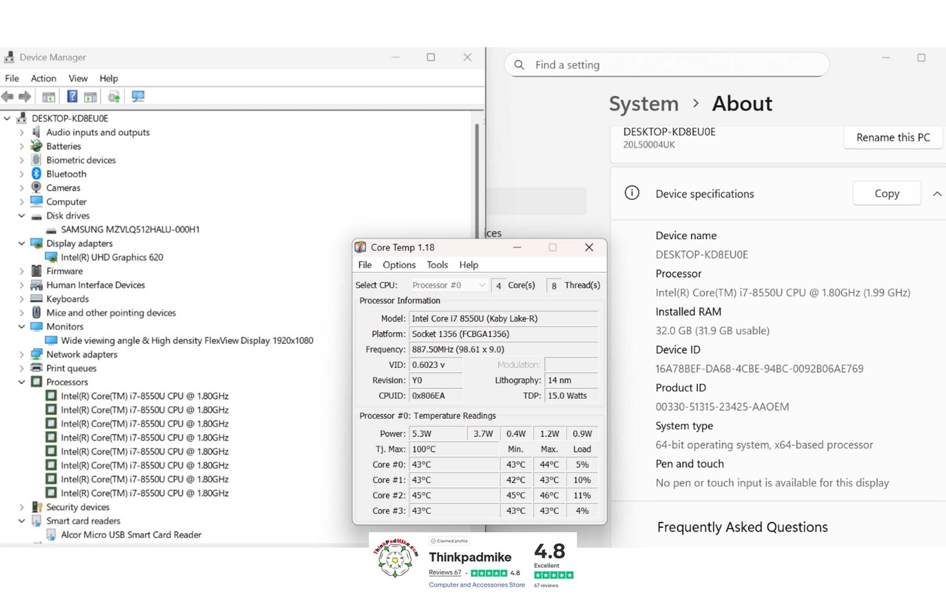 The internal fan has been removed cleaned, hoovered then new thermal paste applied to the heatsink, fan re-seated and sprayed with compressed air to ensure of a cool quiet running experience as you can see from the good processor temperature reading via the Core Temp App. The motherboard is checked for any signs of liquid spills and sprayed with compressed air to remove any dust or debris. The keyboard has been fully tested and cleaned with a sanitizer solution to remove any dirt and grime! All exteriors of the laptop are then cleaned with a sanitizer solution using a microfiber cloth. The screen is cleaned using a non-smear solution and a specialized LCD screen cleaning cloth. All ports are checked and tested as working.