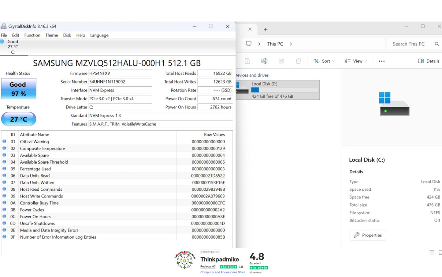 The SSD has been checked using the Crystal Disk Info application and it reports Good health and a good temperature as you can see. The laptop then has a full diagnostic scan to ensure there are no failings or issues, as you will see in the video it passed without any issues. It is then left to run for at least 24 hours (generally 48 hours) without been allowed to sleep or hibernate to ensure no issues develop.
