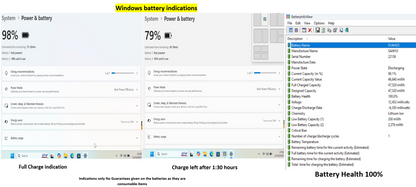 This model has one replacement external 6 battery Windows has indicated 7:33 after a full charge, the laptop has then been left to run on the batteries for 1:30 hours after which Windows indicated 6:19 hours remaining @ 79%