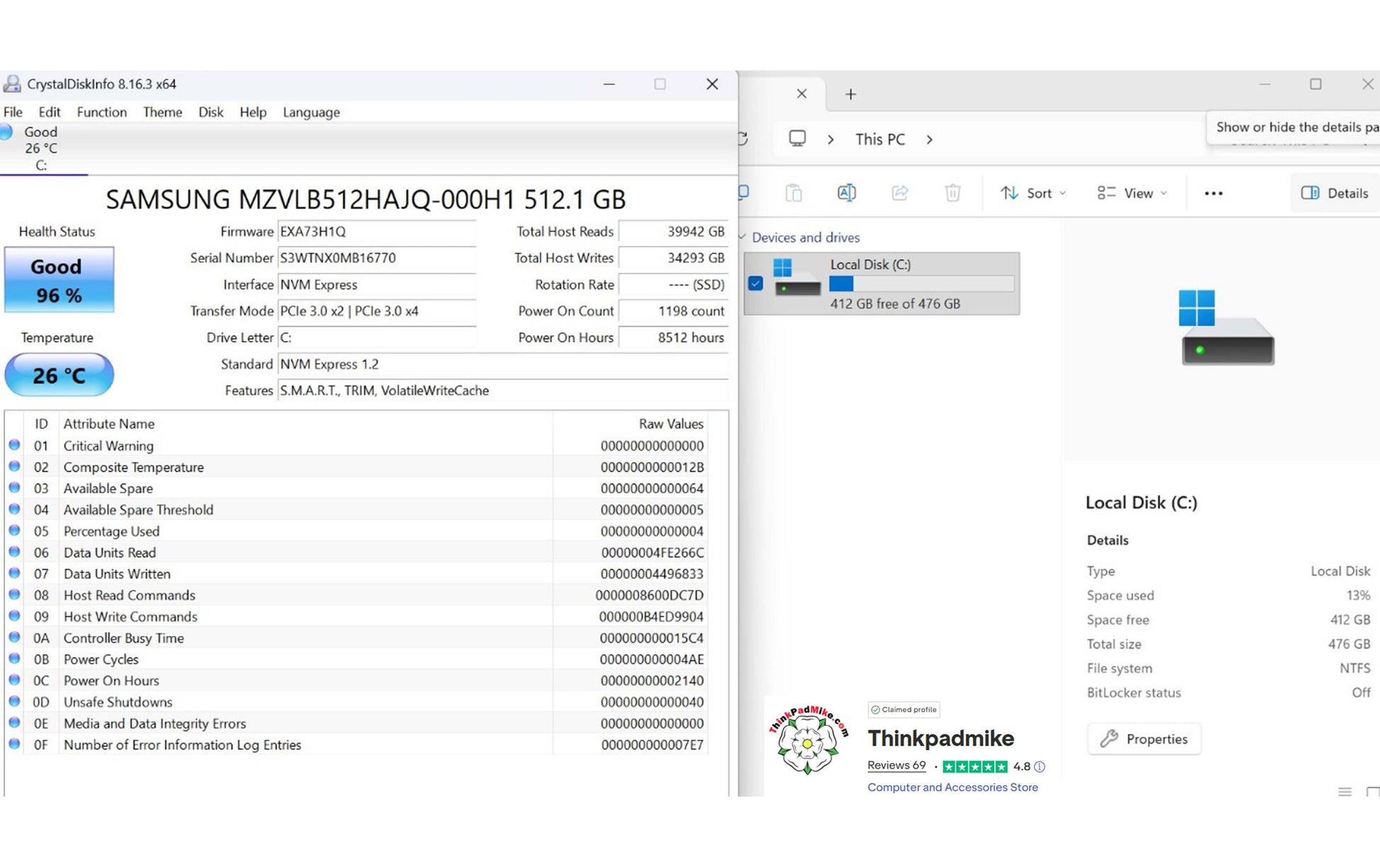 The SSD has been checked using the Crystal Disk Info application and it reports Good health and a good temperature as you can see. The laptop then has a full diagnostic scan to ensure there are no failings or issues, as you will see in the video it passed without any issues. It is then left to run for at least 24 hours (generally 48 hours) without been allowed to sleep or hibernate to ensure no issues develop.