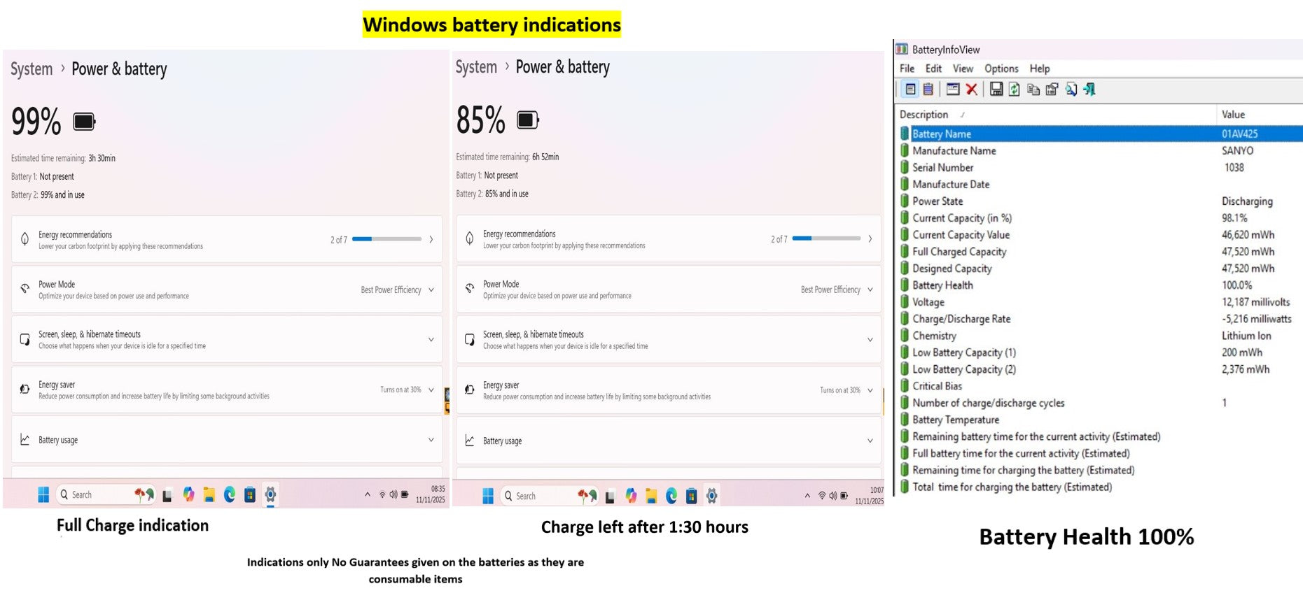 This model has one replacement external 6 cell battery Windows has indicated 3:30 after a full charge, the laptop has then been left to run on the batteries for 1:30 hours after which Windows indicated 6:52 hours remaining @ 85%. Please note this laptop has one battery installed. A second battery was optional when the laptop was originally manufactured. However, this laptop does not include the second battery.