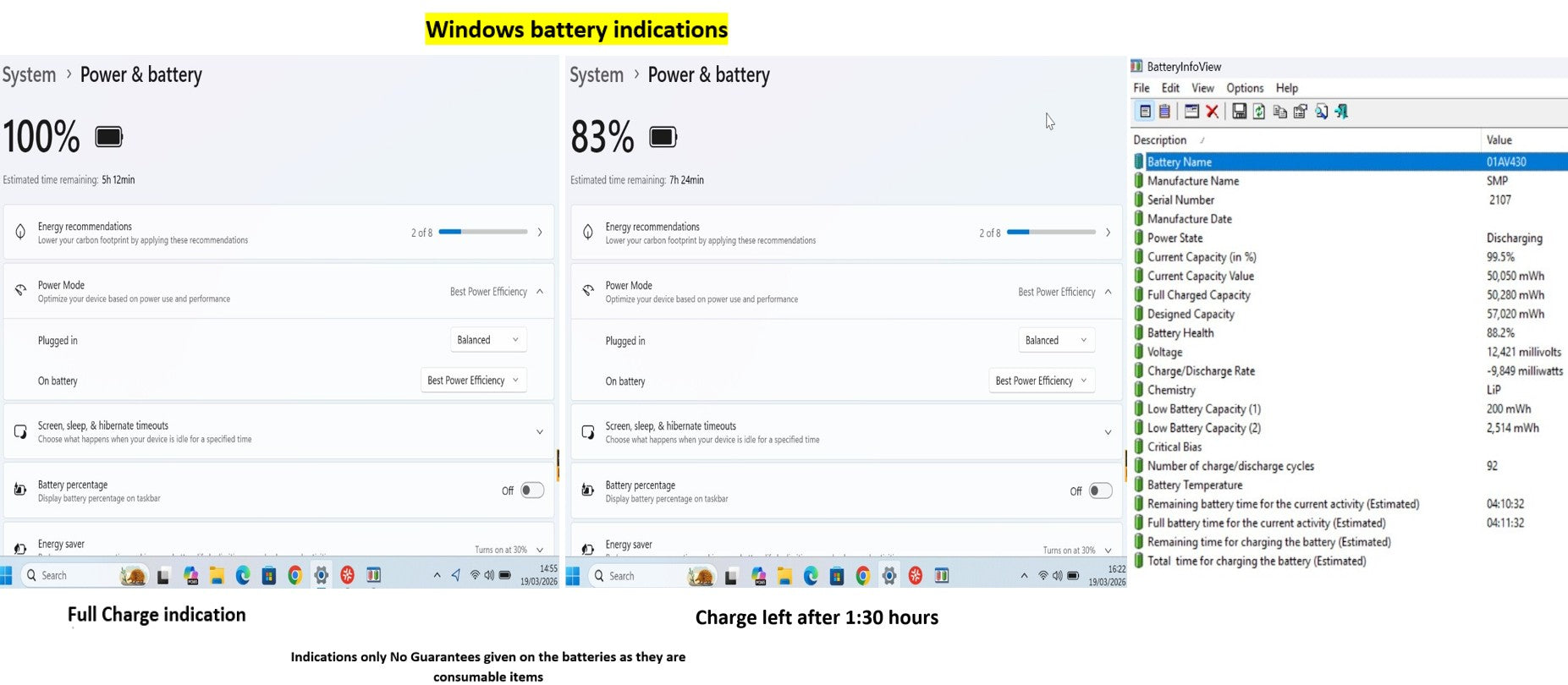 This model has one internal battery Windows has indicated 5:12 after a full charge, the laptop has then been left to run on the battery for 1:30 hours after which Windows indicated 7:24 hours remaining @ 83%.