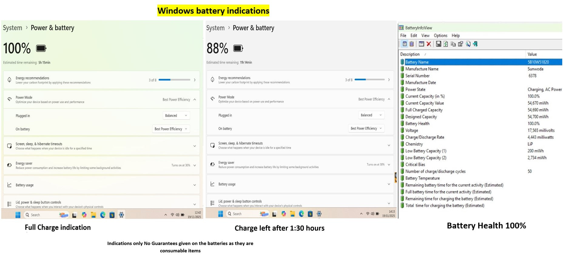 This model has 1 x 41Wh Internal battery Windows has indicated 5:15 after a full charge, the laptop has then been left to run on the batteries for 1:30 hours after which Windows indicated 11:14 hours remaining @88%