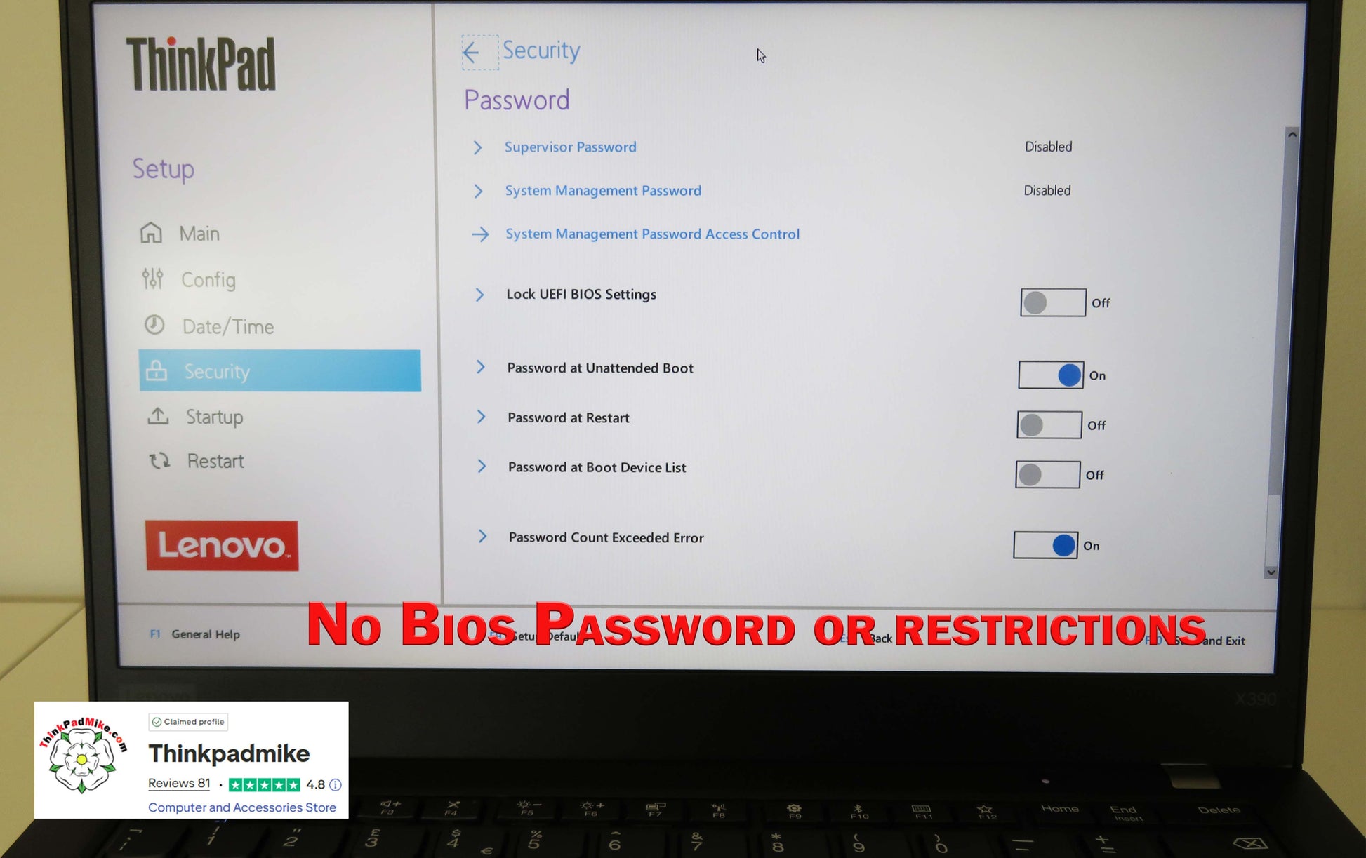 It's noteworthy that the BIOS of the Lenovo ThinkPad x390 is free from any set passwords or restrictions. This means you have full access and control over the BIOS settings, allowing you to customize and configure the laptop according to your preferences without any limitations. This level of flexibility is beneficial for users who may need to make specific adjustments to their laptop's BIOS settings for various purposes