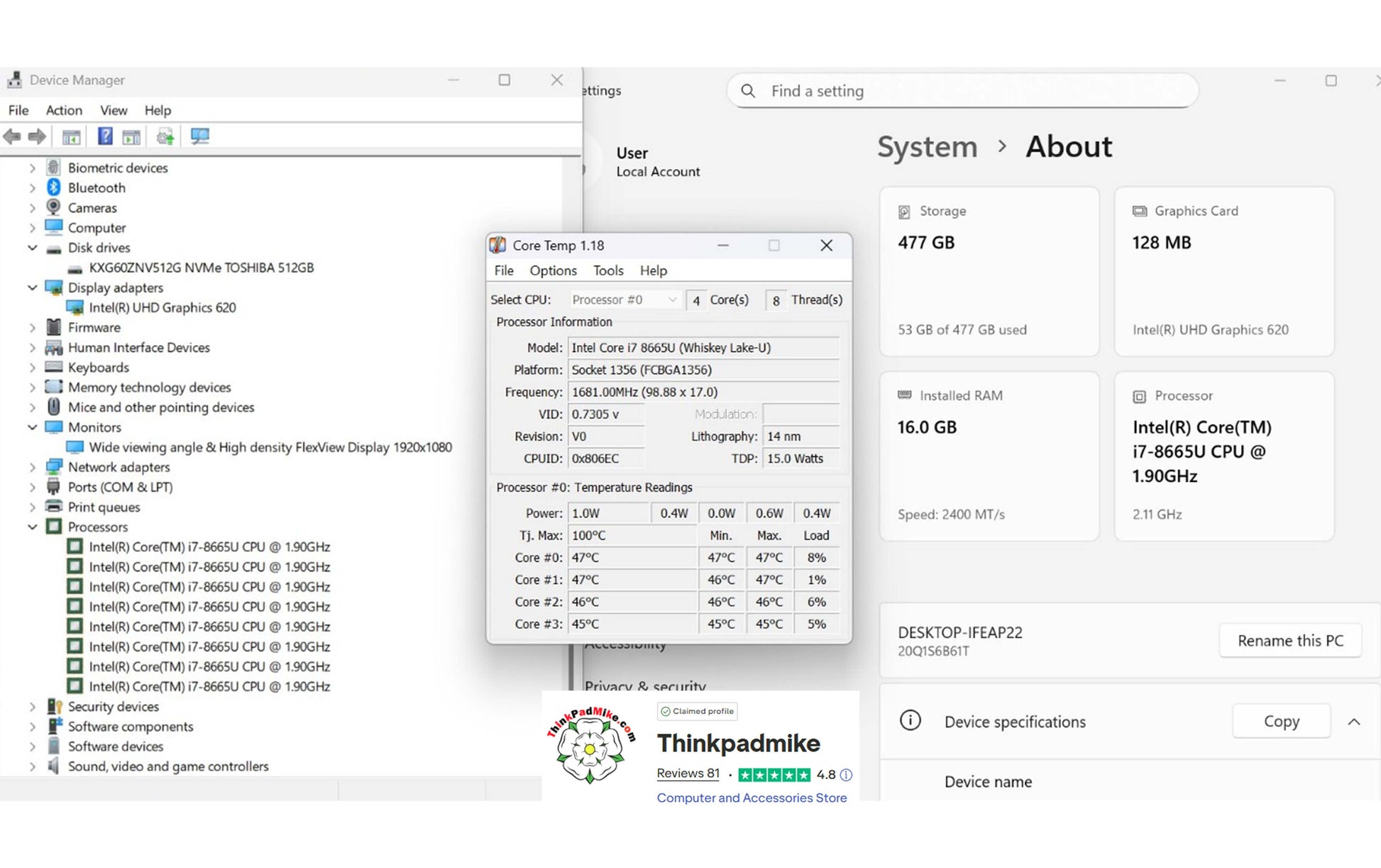 The internal fan has been removed cleaned, hoovered & sprayed with compressed air new thermal paste applied to the heat sink then re seated to ensure of a cool quiet running experience as you can see from the good processor temperature reading via the Core Temp App. The motherboard is checked for any signs of liquid spills hoovered then sprayed with compressed air to remove any dust or debris. The keyboard has been fully tested hoovered then cleaned with a sanitizer solution using a toothbrush to remove any dirt and grime! All exteriors of the laptop are then cleaned with a sanitizer solution using a microfiber cloth. The screen is cleaned using a non-smear solution and a specialized LCD screen cleaning cloth.